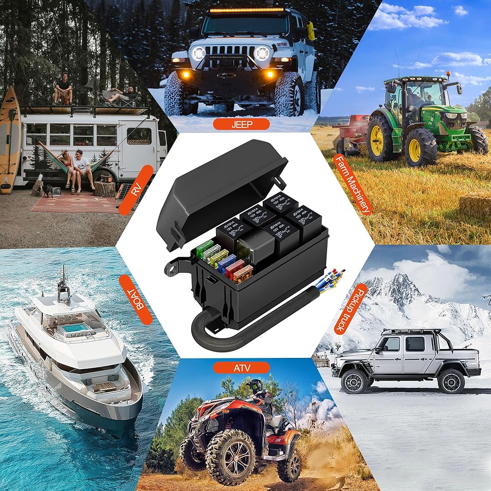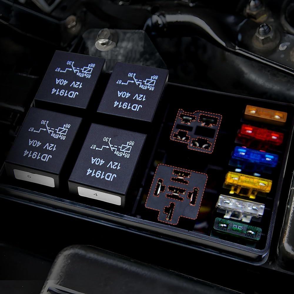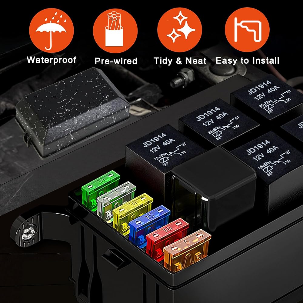 صندوق مصهر ومرحل عالي القدرة: مجهز بمرحلات 5p 5-Pin JD1914 12V 40A و1p 4-Pin RTT7121 12V 40A Relay، 6 صمامات شفرة ATC/ATO 5A، 10A، 15A، 20A، 25A، 30A. كتلة تتابع الصمامات العالمية لمركبات السيارات 12 فولت Jeep SUV UTV ATV RV شاحنات التقاط السيارات والقوارب البحرية.