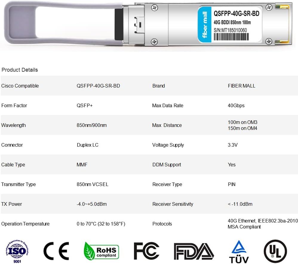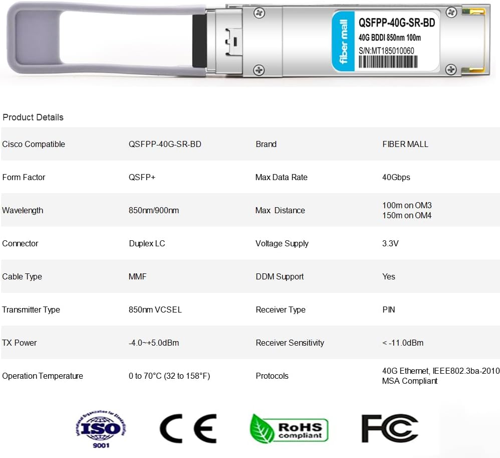 • 【40GBASE-SR4】وحدة إرسال واستقبال QSFP+، 40 جيجابت في الثانية، وضع متعدد، 850 نانومتر، 150 متر، موصل MTP/MPO، مزدوج الاتجاه بأربع قنوات، قابل للتوصيل السريع، يدعم DOM