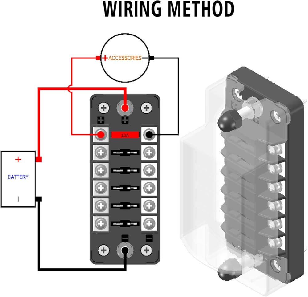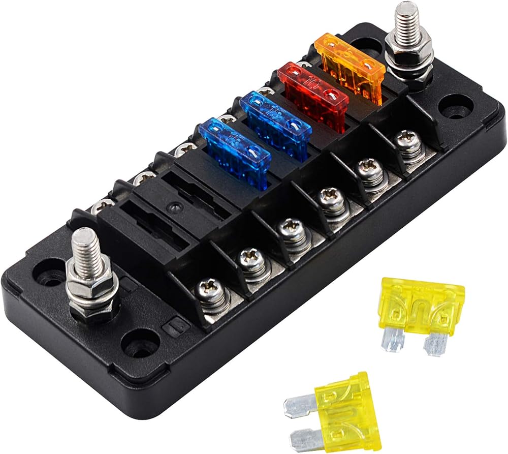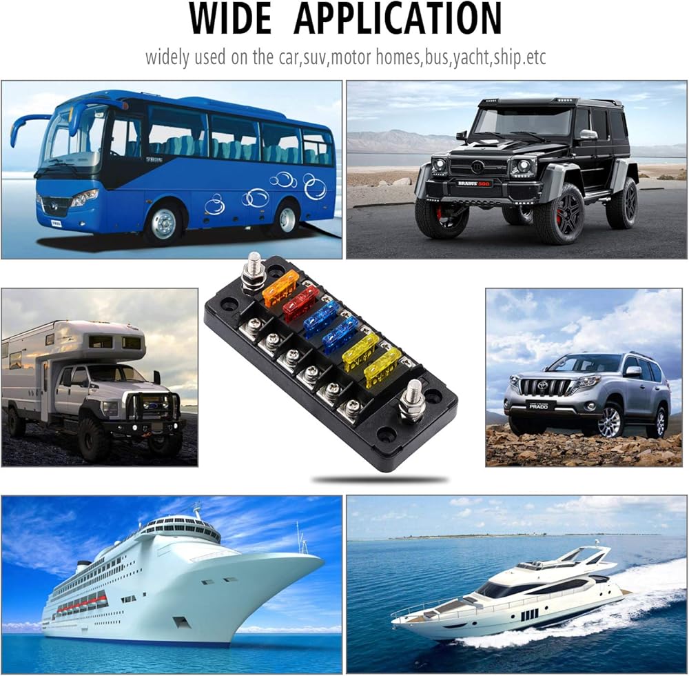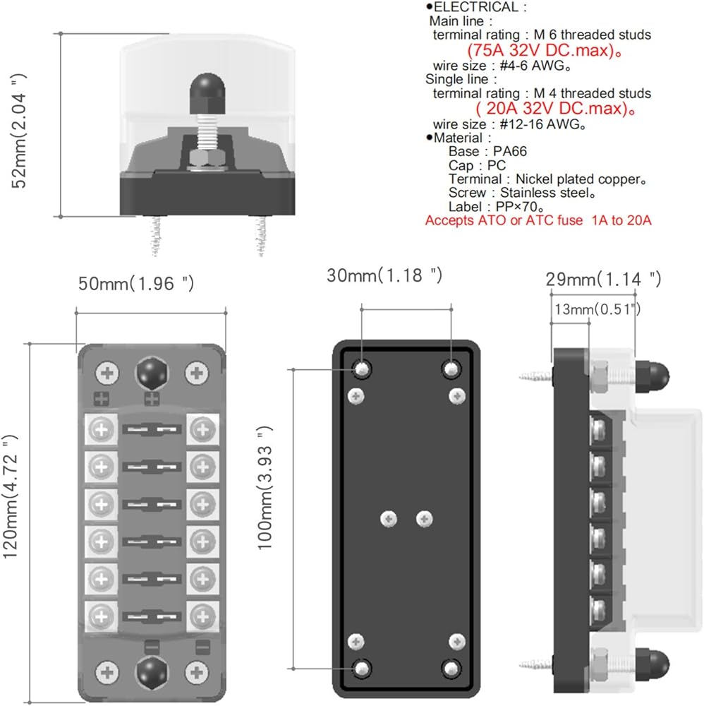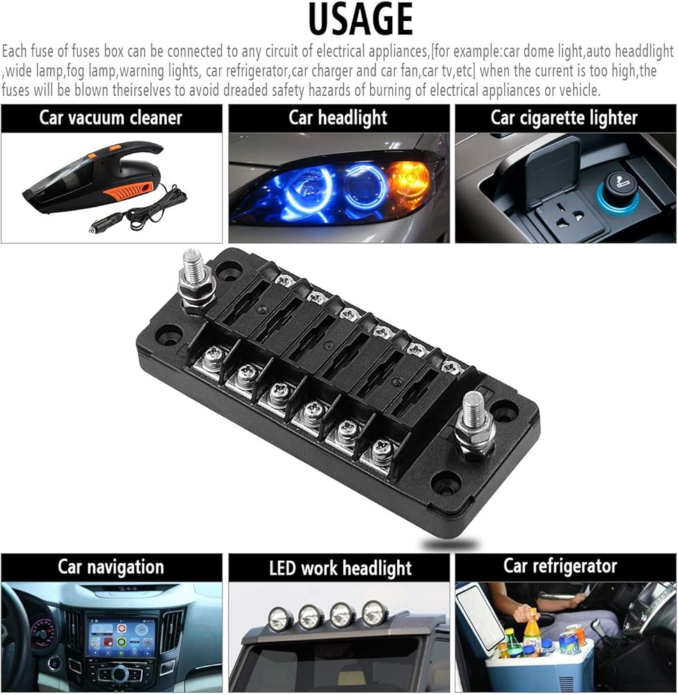 • The 6-Way Fuse Box is suitable for DC circuit connection within 32V, with the maximum load circuit of 100A and no more than 30A for each circuit.