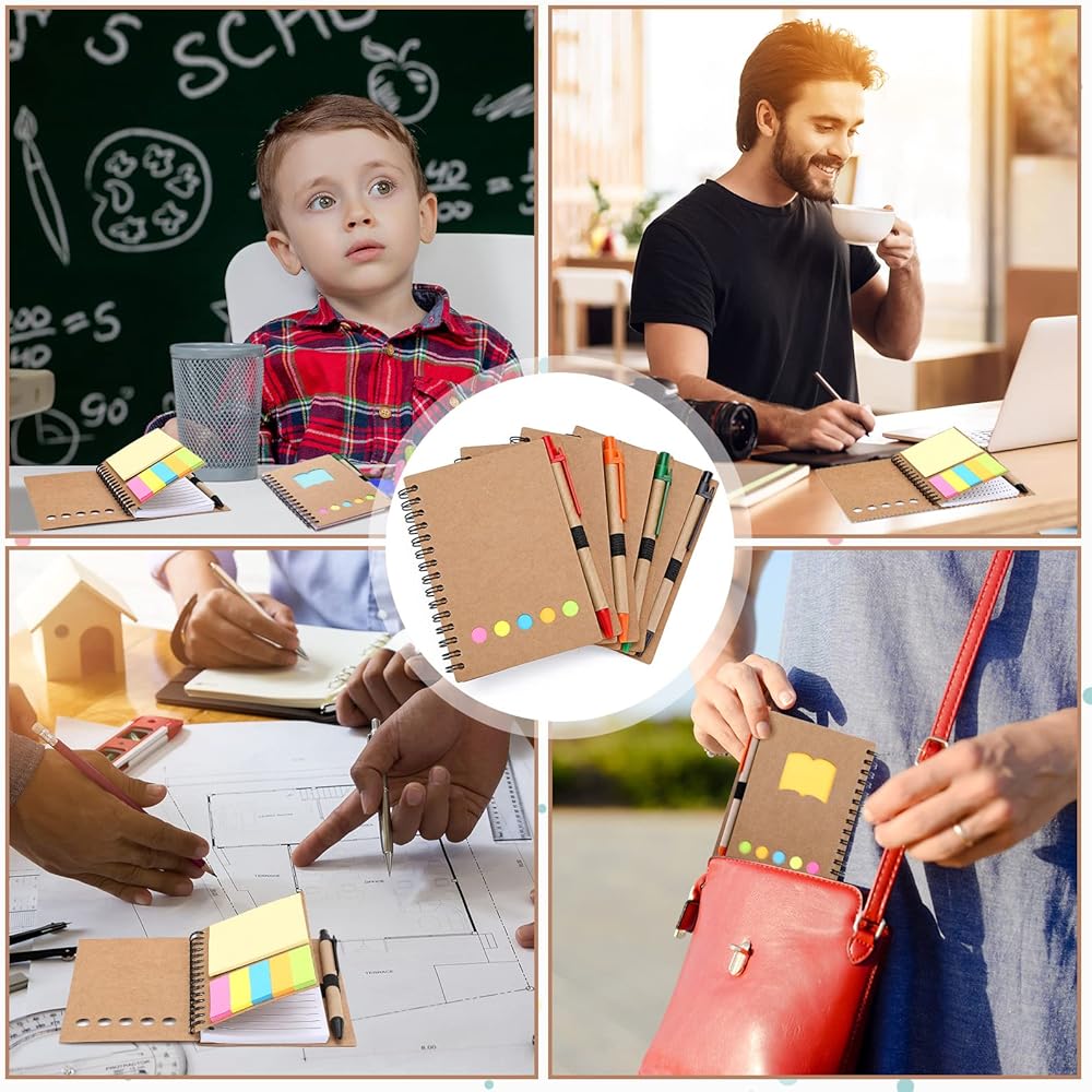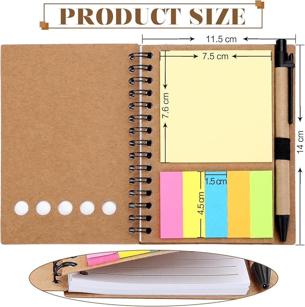 الكمية: 4 عبوات من دفاتر الملاحظات الحلزونية إجمالاً، تتضمن 200-280 ورقة من الورق الأبيض المبطن، 4 قطع أقلام، 80 قطعة من الملاحظات اللاصقة و5 ألوان لعلامات الصفحات اللاصقة (80 قطعة لكل لون)