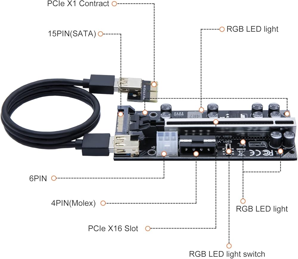 • * Multiple power supply options, PCIe 6pin, Molex, SATA15pin, which provides graphic card independent power and reduces motherboard burden when using more graphic cards. Also PCIe 1x to 16x extension cables with multi-layer shields to prevent signal loss.