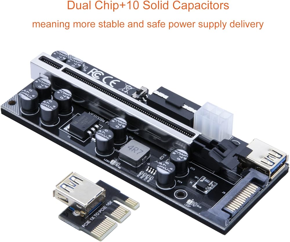 • * 10X high quality capacitors GPU RISER, the most capacitors riser card on market, more capacitors results in less electrical fluctuations, meaning more stable currents transient- the loads and heat losses spread across multiple cap which will prolong their life, better protect your device away from over current, heat and voltage.