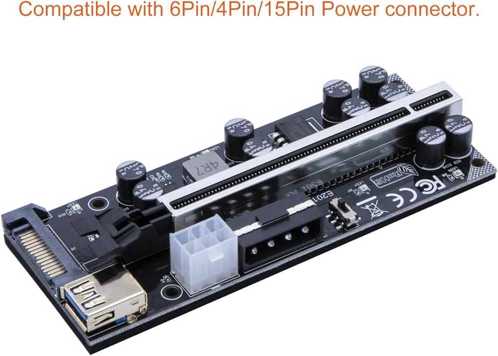 Mailiya V009s Pro PCIe Riser، بطاقة GPU Riser لتعدين العملات المشفرة 16X إلى 1X، محول Riser مدعوم مع 10 مكثفات صلبة/حالة LED لتعدين BTC/Ethereum ETH (6 حزم)