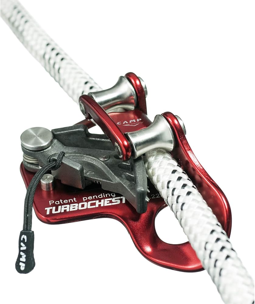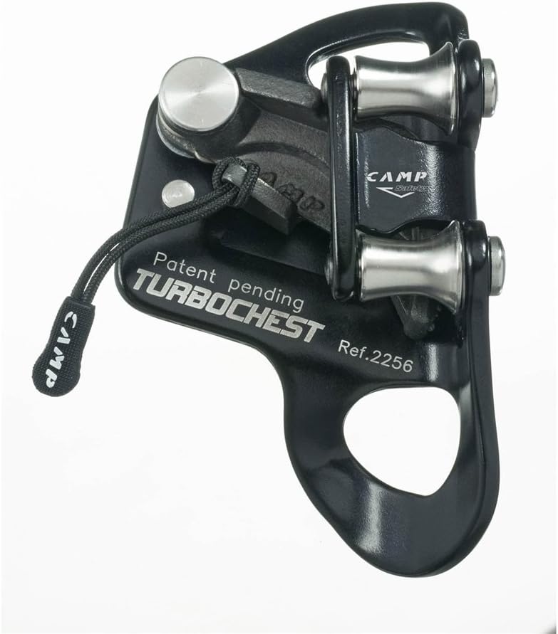 A revolutionary chest ascender that features two proprietary rollers for a smooth interface with the rope. This not only helps with climbing efficiency by making the upward glide much smoother. It also reduces dangerous wear on the device where the rope tends to rub on the body of a traditional ascender. The perfectly profited closure keeps the rope in line with the body of the device and the rollers to prevent the rope from escaping the device during tight pendulums and traverses. Self cleaning holes on both the body and the cam. Thicker body plates and a shaped connection point reduce wear on the device caused by shifting between the device and the connector (especially when used with steel connectors). This also keeps the device more in-line with the body during use. The opening mechanism is simple and secure with the ability to lock the device open for easier attachment and a removable pull cord that makes it easier to operate while wearing gloves. The proprietary rollers also allow the Turbochest to be rigged as a locking pulley for light hauling with a max load of 50 kg, 110 lbs. Proprietary rollers increase climbing efficiency and decrease wear and tear on the device and ropes Super smooth action and increased safety on traversing maneuvers Thicker body plates and a shaped connection point reduce shifting between the device and the connector Can be rigged as a locking pulley for light hauling (max load 50 kg, 110 lbs) For ropes from 8 to 13 mm NOTE: This configuration is not intended for hauling or securing of bodies when used as a pulley. Certified according to EN 12841/B for semi-static ropes ranging from 10 to 13 mm and EN 567 for ropes from 8 to 13 mm. Weight: 111g Rope Diameter Min (mm): 8 Rope Diameter Max (mm): 13 UIAA: Yes