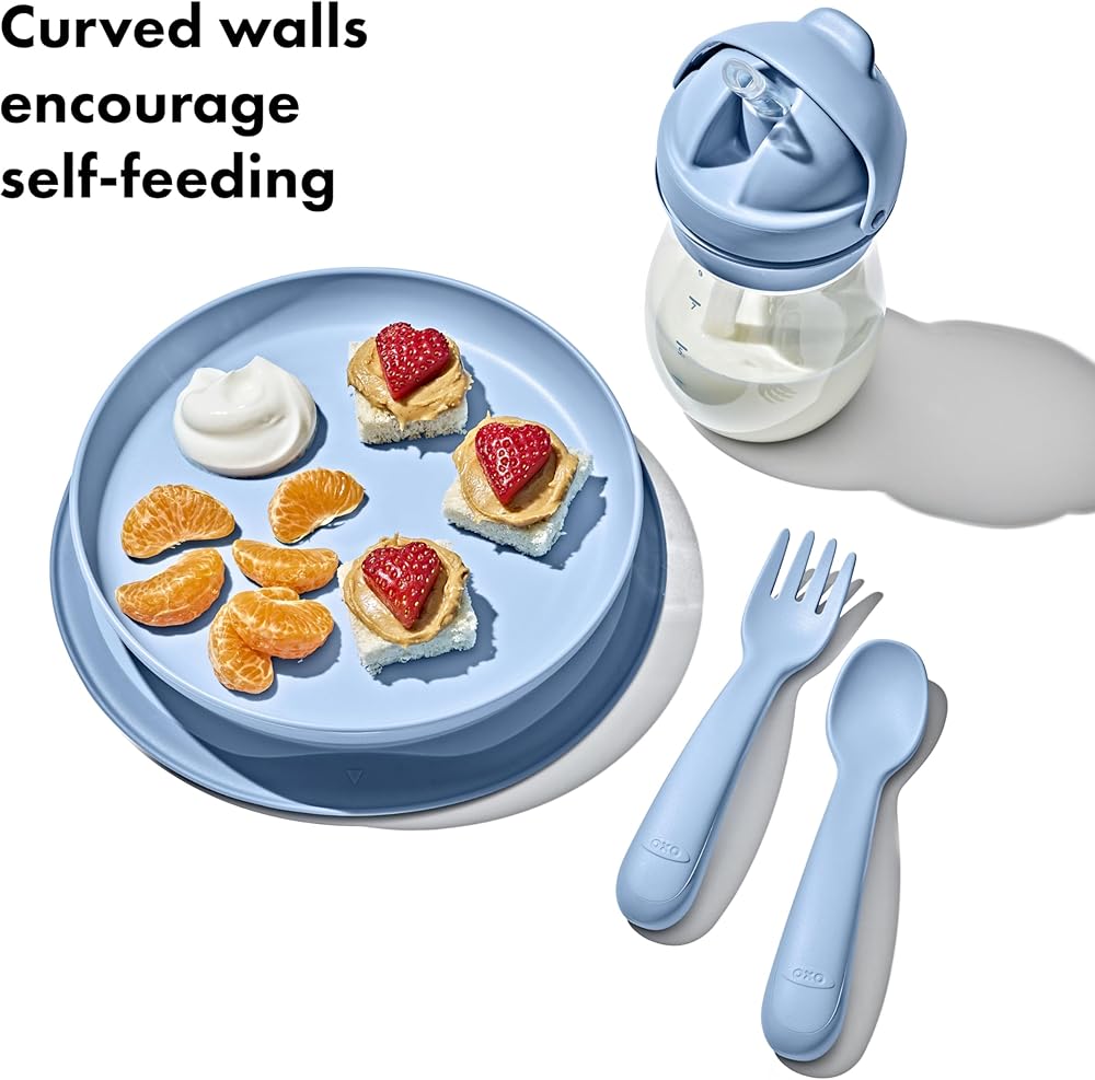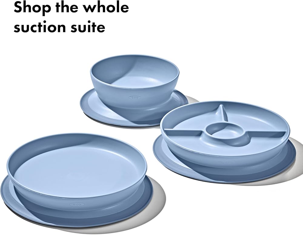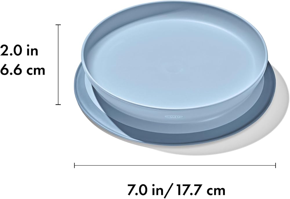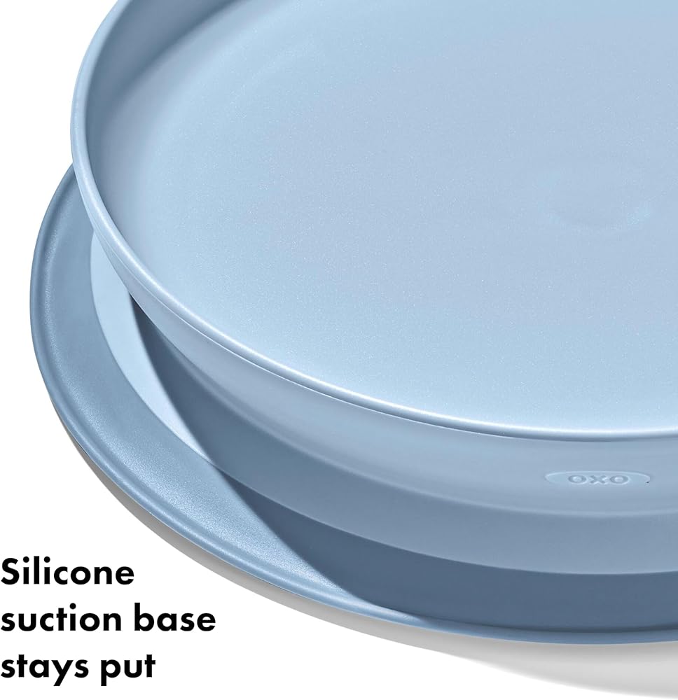 Cut down on mealtime messes with the OXO Tot Stick & Stay Suction Plate. The Plate features a silicone base that sticks surfaces until mealtime is over, preventing sliding, slipping and tipping. A parent-friendly opening makes removing the Plate simple for adults, but tough for kids. Tall, curved side walls allow for easy scooping and encourage self-feeding. When your child is finished, twist the Plate and base apart for quick cleaning in the dishwasher.
