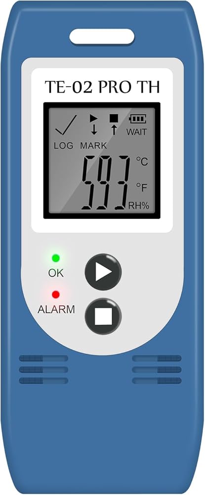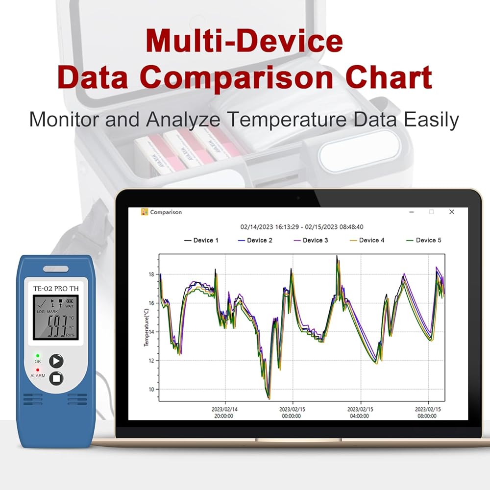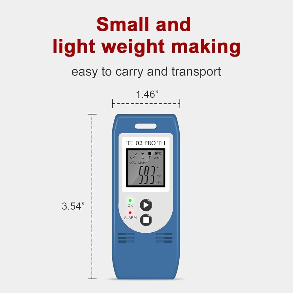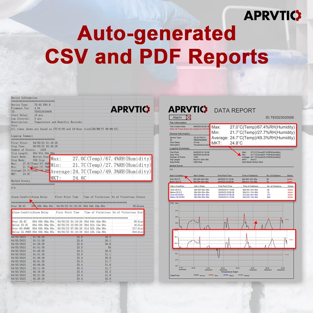 مسجل بيانات درجة الحرارة والرطوبة من Aprvtio TE-02PRO-H، مسجل درجة حرارة USB متعدد الاستخدام مع 32000 قراءة، ثلاجة لقاح، تقارير PDF وCSV التلقائية، مؤشر تنبيه LED، معتمد للمعايرة