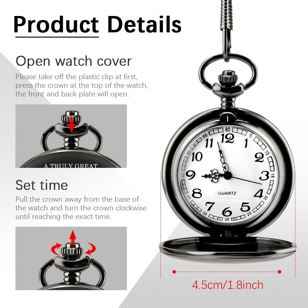 💖ساعة جيب المعلم - يرجى خلع المشبك البلاستيكي في البداية، اضغط على التاج الموجود أعلى الساعة، وسيتم فتح اللوحة الأمامية والخلفية. اسحب التاج بعيدًا عن قاعدة الساعة وأدر التاج في اتجاه عقارب الساعة حتى تصل إلى الوقت المحدد. يمكن إعطاء الساعات المنقوشة بالأمثال أو الاقتباسات الملهمة له للرجال والأب والجد والأزواج والأخ والزميل والابن والصبي والحفيد وأفضل صديق ومعلم ومعلم.