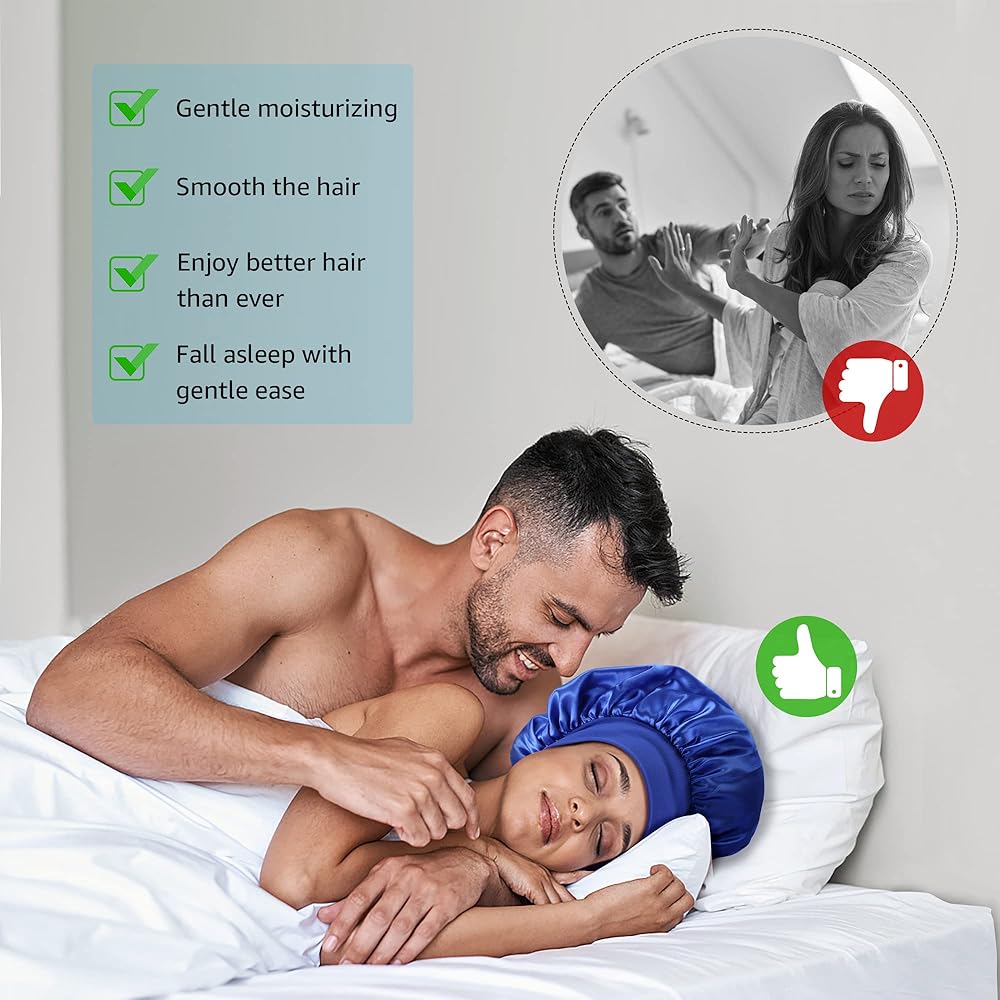 HIGH-QUALITY MATERIAL: This silk satin fabric offers several benefits for the wearer. Silk Bonnet for Sleeping has a luxurious feel Satin Bonnet is gentle on the skin and hair, reducing friction as you sleep. This leads to improved hydration of your skin and hair, and can reduce breakage, bedhead, split ends, and dryness.