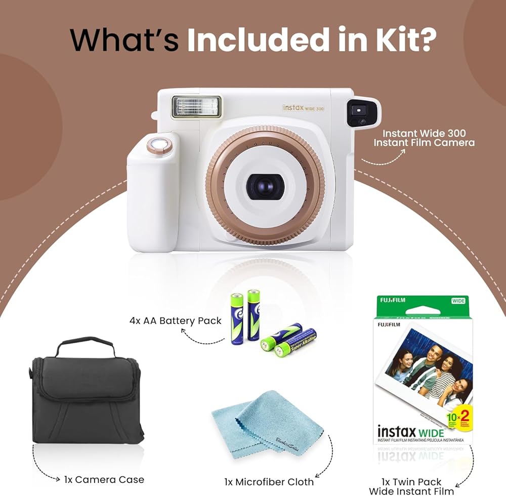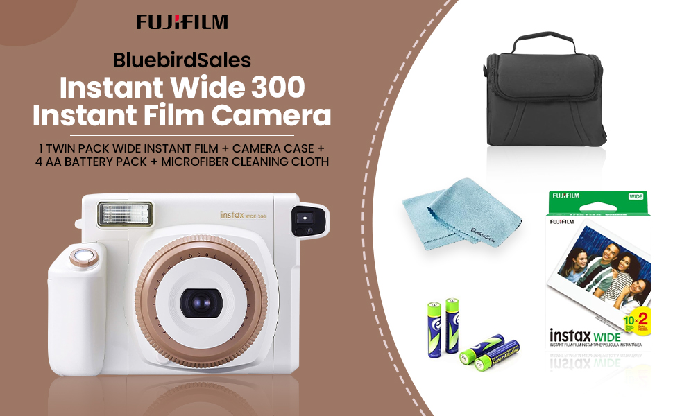 FUJIFILM Instant Wide 300 Instant Film Camera (Toffee) + 1 Twin Pack Wide Instant Film + Camera Case + 4 AA Battery Pack + BluebirdSales Microfiber Cleaning Cloth