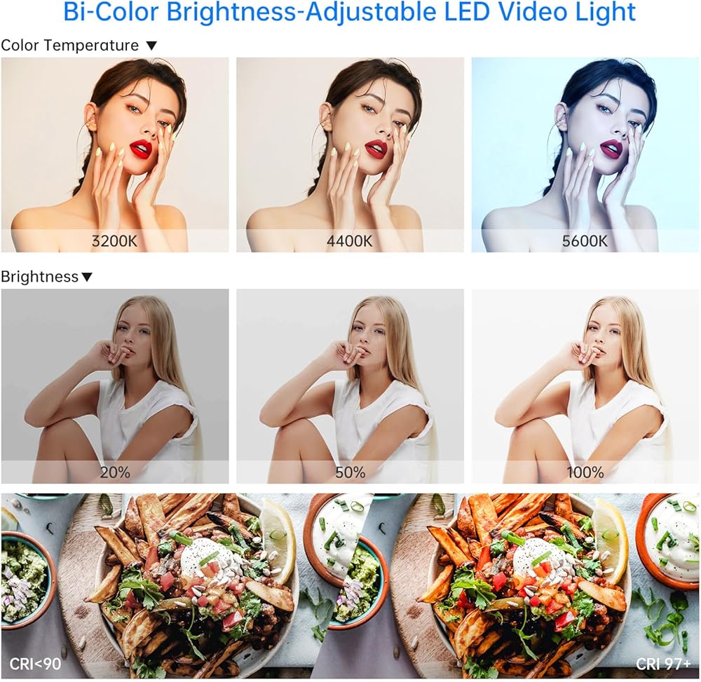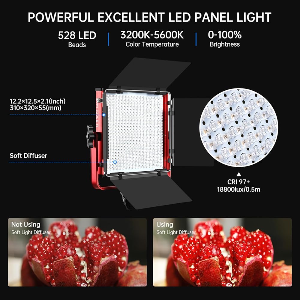 مجموعة إضاءة LED عالية التجويف: يمكن لمصابيح الفيديو هذه المزودة بـ 528 قطعة من خرزات LED ذات التركيز 45 درجة أن تنبعث منها إضاءة أكثر سطوعًا من مصابيح الفيديو LED العادية الأخرى. High CRI & TLCI 97+، قريب جدًا من ضوء الشمس، يمكن أن يجعل تشبع الصور يبدو أكمل وأكثر جمالاً.