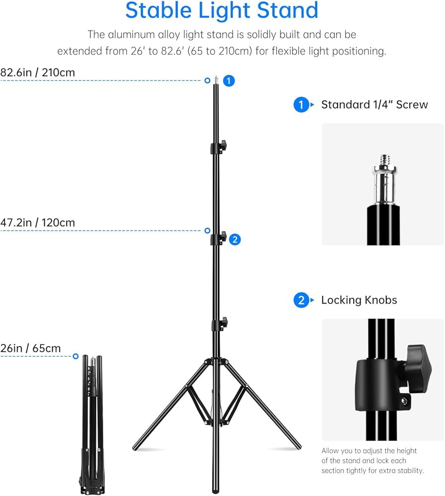 تشتمل المجموعة على: 2 × مصباح فيديو LED ثنائي اللون مع دعامة U وباب الحظيرة، 2 × موزع أبيض، 2 × محول طاقة، 2 × كابل طاقة، 2 × 22 بوصة - 78. حامل إضاءة قابل للتعديل مقاس 8 بوصات، 1 × حقيبة حمل