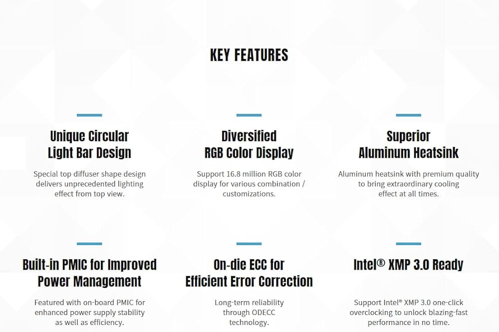 رفع تردد تشغيل الذاكرة بنقرة واحدة، دعم Intel XMP 3.0 وAMD EXPO: يمكن أن يكون رفع تردد التشغيل أمرًا سهلاً للغاية! تمت برمجته باستخدام ملفات تعريف Intel XMP 3.0 وAMD EXPO، ويتم توفير الإعداد الأمثل للتوقيت والجهد والسرعة افتراضيًا عند استخدام CRAS V RGB. (للحصول على سرعة الذاكرة المحددة مع ملف تعريف XMP 3.0 أو EXPO، يرجى التأكد من المواصفات وحدة المعالجة المركزية واللوحة الأم لديك تدعم السرعة المقابلة مقدمًا.)