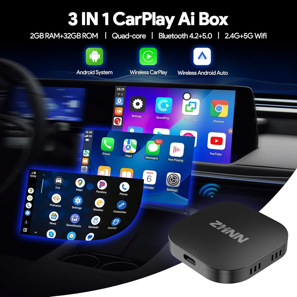 【Wireless Carplay/Android auto/Mirrorlink】Powered by Android system, with 2GB+ 32GB memory, 2.4/5GHz. 4 core low-power chip, this car ai box delivers a lag-free,stable and mutitasking streaming speed. Support wireless Carplay and Android Auto, easily connect and no longer be bothered by messy cables, simply connect your smartphone to access map navigation, phone contacts, email, notifications and more in CarPlay or Android Auto while you focus on the road and driving more safely.