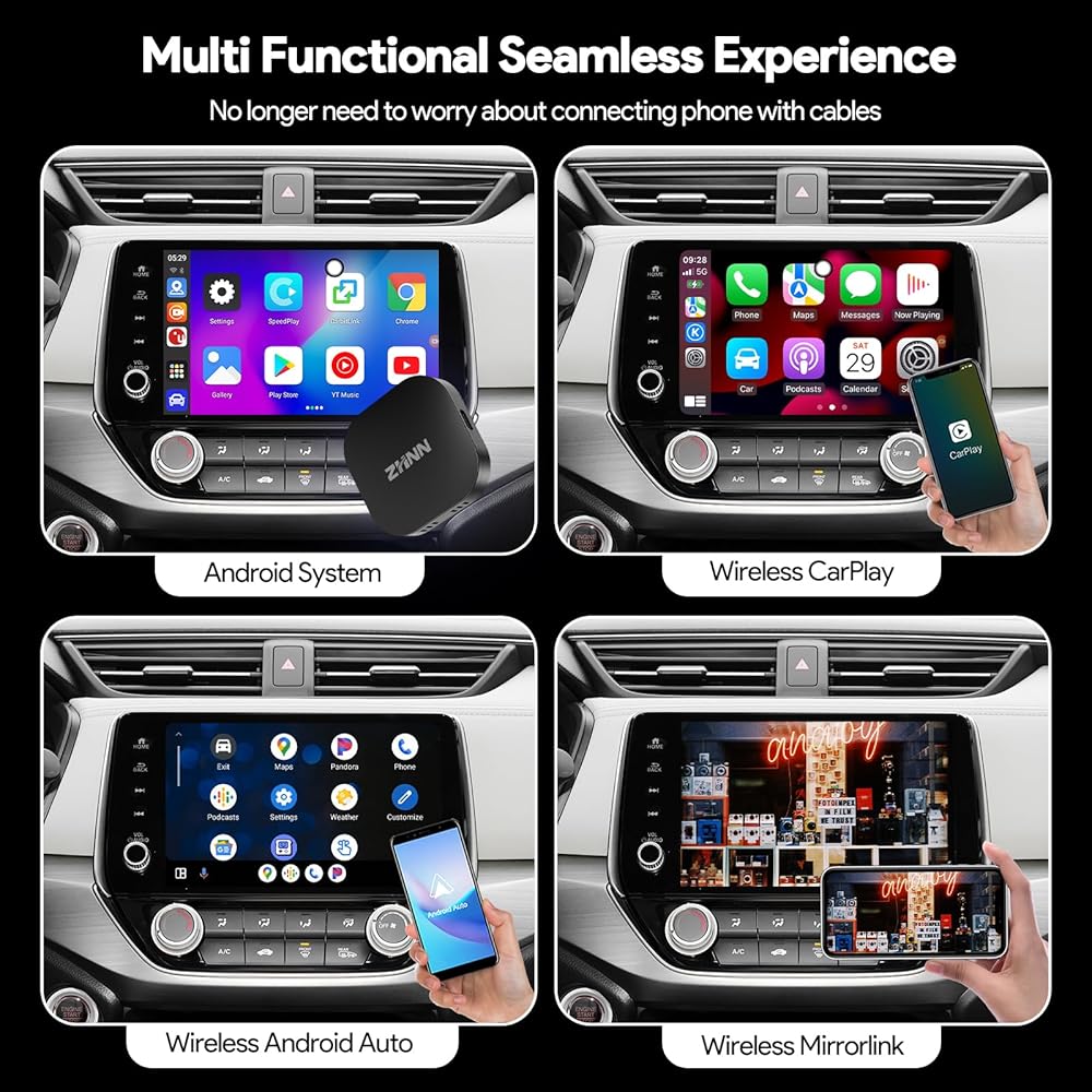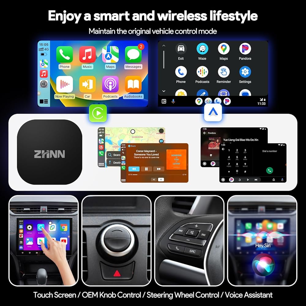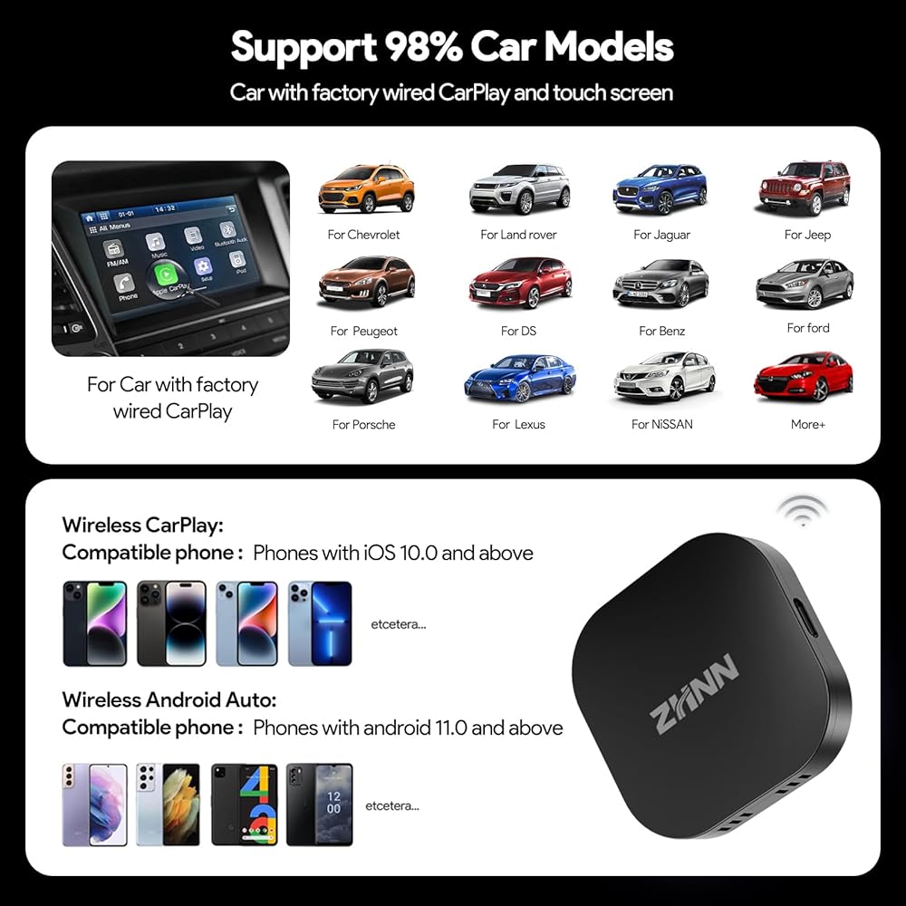 Compatible with cars equipped with factory wired CarPlay or wired Android Auto; For Cars with factory wired Carplay, you can directly use, For cars with wired Android Auto,use a pin to plug the hole (near by USB port )for 2 seconds and it will be converted to android auto port.(Pin Not included)
