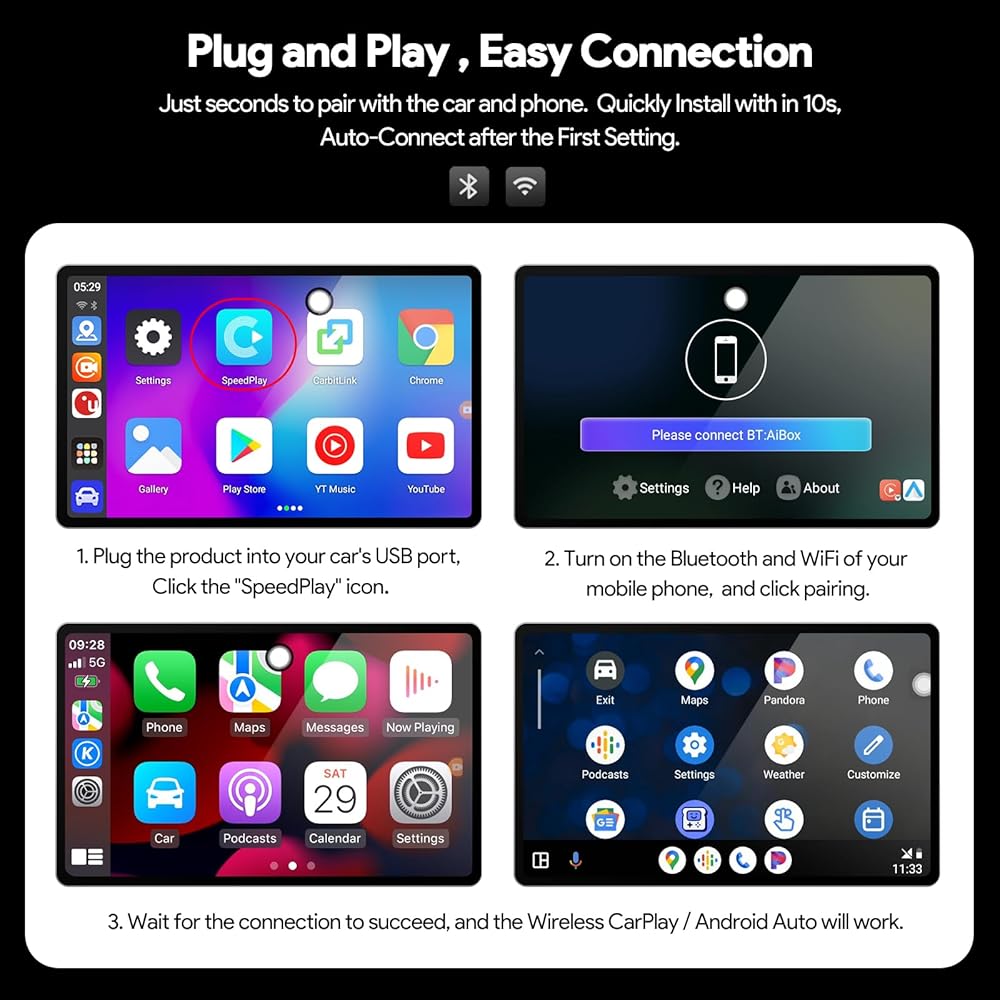 【Cable-Free Connectivity, Plug and Play】The CarPlay Android Auto magic ai box offers a seamless experience with its plug-and-play functionality, connecting to the car's USB/Type-C port and pairing with your phone via Bluetooth. After an initial setup, it will automatically connect your car and phone every time you enter the vehicle. This ai box is a convenient solution that minimizes damage to phones, replacing the need for complex cables and costly car systems.