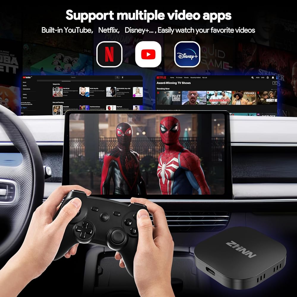 【Multimedia Video Box with Netflix, YouTube, Mirrorlink】This carplay box not only adds wireless Car Play or Android Auto to your car, but also comes with its own Android system, allowing you to install your own apps from the Play Store after connecting WIFI or Hotspot. With YouTube, Netflix pre-installed, whether you want to watch movies, listen to music or even play games on your car's infotainment system, you can enjoy it while waiting for your families.