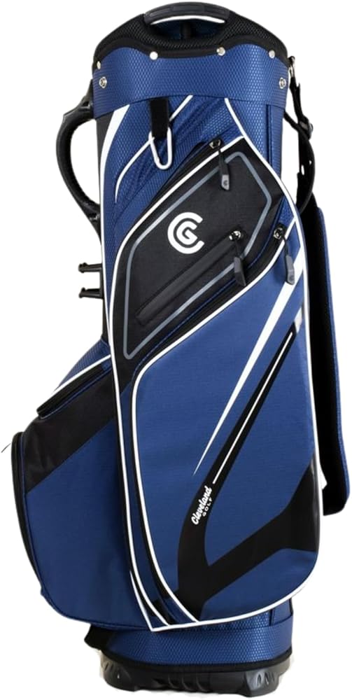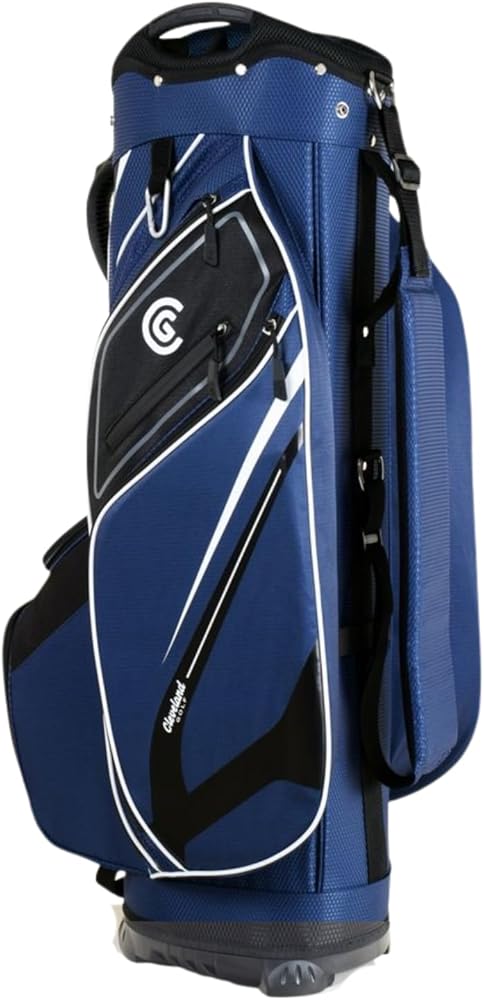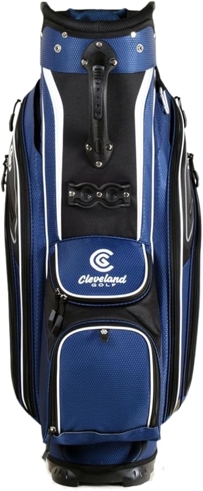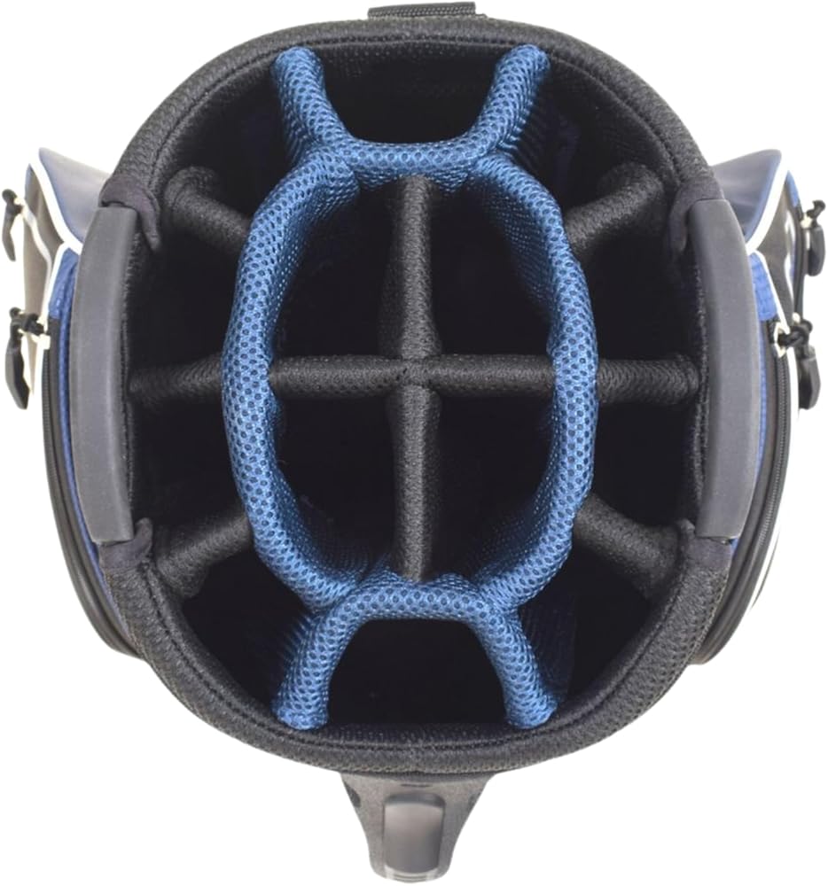 9.5” 14-way divider, 2 grab handles for easy loading, Velour lined valuables pocket with, water-resistant zipper, Score cards pocket, Golf balls holder, Glove holder Insulated cooler bottle pocket, 8 convenience pockets, Bottom base with cart lock feature, Hidden umbrella containment, Carabiner clip for towel, Detachable front pocket for customization, Weight: 5.4 lbs, Material: Polyester