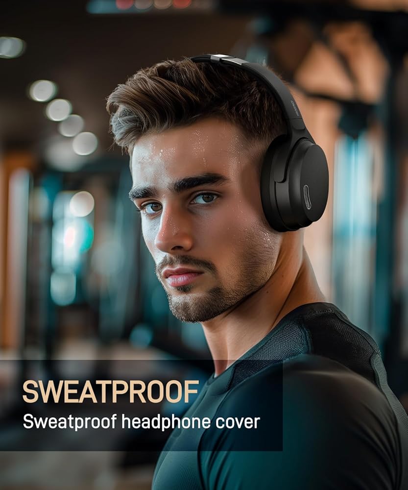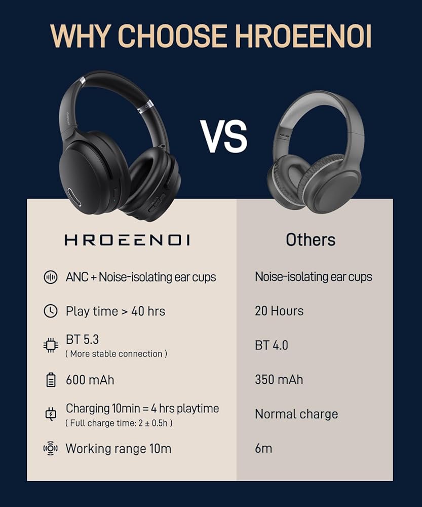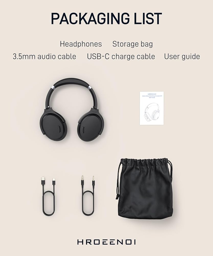 سماعات HROEENOI Premium اللاسلكية بتقنية البلوتوث فوق الأذن مع خاصية إلغاء الضوضاء النشطة - مثالية للصالة الرياضية والتدريبات والدراسة والمدرسة - ميكروفون مدمج - تصميم أسود أنيق