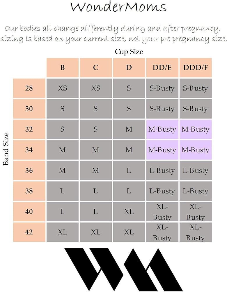 • OUR BODIES ALL CHANGE DIFFERENTLY – During and after pregnancy our bodies are changing, WonderMoms bra sizing is based on the size you currently are in both bust and band. All WonderMoms bras come with a free band extender to help get the right fit for a changing body. Please see the size chart image for fit details.