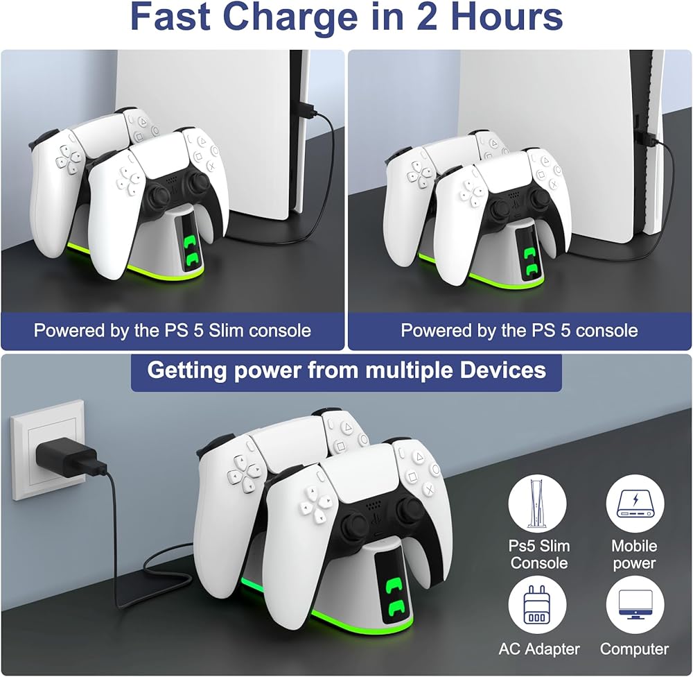 • ✨【شحن مزدوج سريع وفعال】- تم تحسين محطة شاحن وحدة التحكم PS5 هذه للشحن السريع والمتزامن لوحدتي تحكم PS5، مما يكمل العملية خلال ساعتين فقط. ويعمل حامل وحدة التحكم PS5 Slim أيضًا مع وحدات التحكم Elite