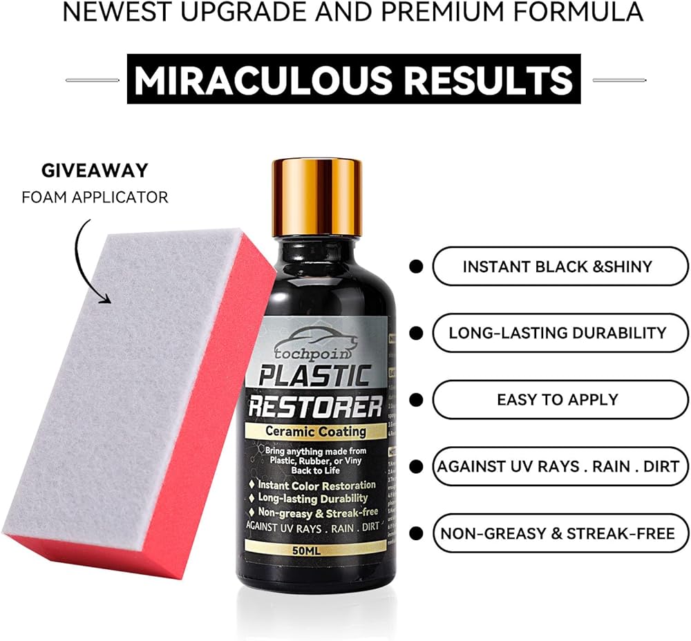 اجعل سيارتك تبدو جديدة مرة أخرى - يستخدم مرمم البلاستيك للسيارات لدينا أحدث التقنيات والمواد عالية الجودة لإصلاح البلاستيك الباهت أو المبيض أو القديم بسرعة، واستعادة لونه الأصلي، والعودة إلى اللون الأسود وتعزيز اللمعان. حافظ على مظهر سيارتك جديدًا وتبقى خالية من العيوب.