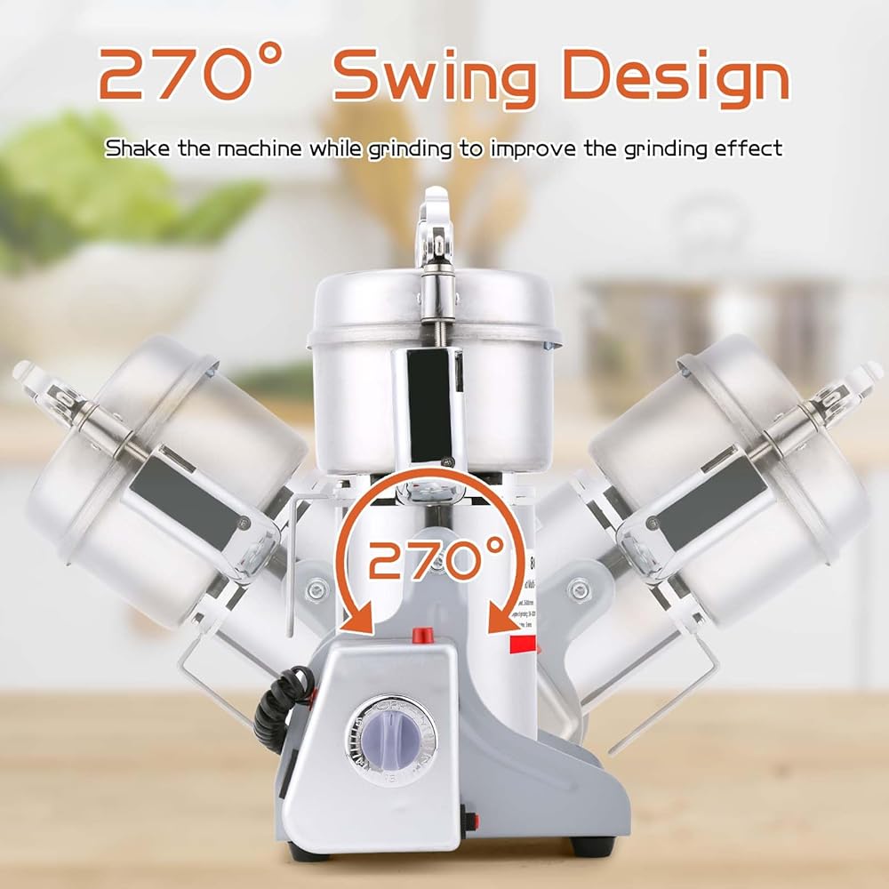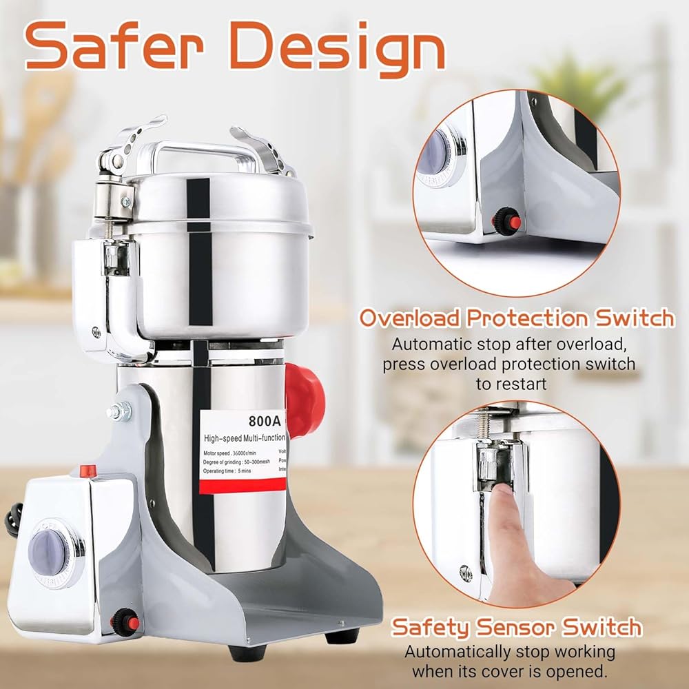 The Electric Grain Mill Grinder is made of 304 food-grade stainless steel to ensure food safety and easy to clean. The cover of the electric grain mill is equipped with a safety induction switch.When the cover is opened while the machine is working, the grain mill will automatically power off and stop working to ensure safety in use. The spice grinder is equipped with an upgraded overload protector. When the grinder is overloaded, the machine will automatically power off and stop working to prevent the motor from burning out in the overload/overheating condition. After the machine cools down, press the overload protection switch for the grinder to continue working. This electric grinder is suitable for various dry/dehydrated materials such as coffee beans, soybeans, rice, corn, wheat, pepper, cumin, dried peppers, animal feed and herbs, etc. (NOTE: Not suitable for wet, fresh, oily or sticky materials.).Various dry materials can be quickly crushed in 30 seconds-3 minutes, it is recommended that the continuous working time should not exceed 3 minutes to avoid problems such as machine overload. After grinding, please clean the remaining powder inside the jar with a cleaning brush and then wipe the inside of the jar with a dry cloth. (The grinding jar is not removable, so do not use water to clean or rinse the motor base directly to avoid damage to the motor).
