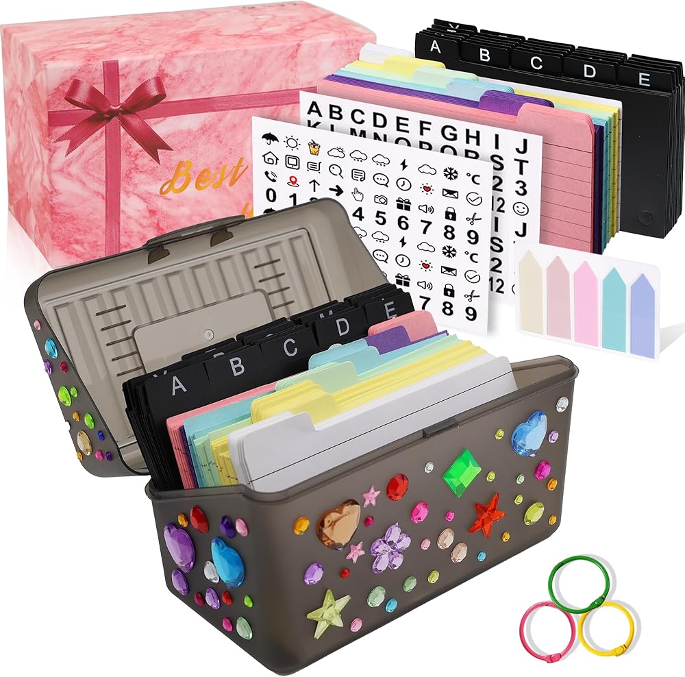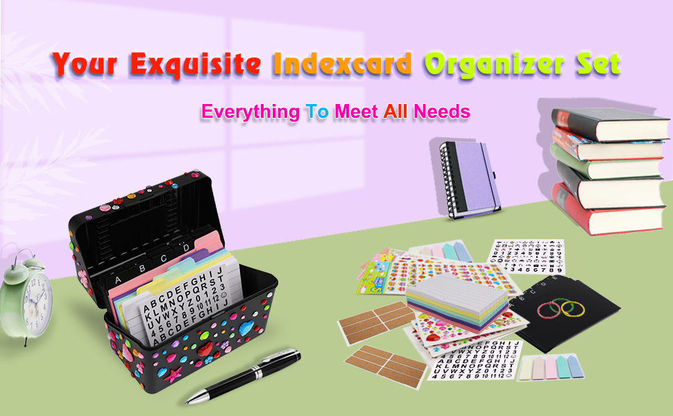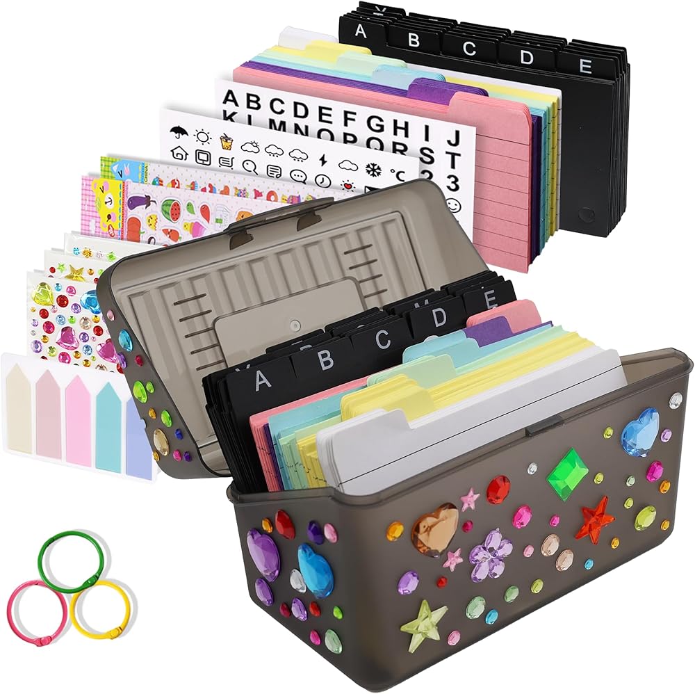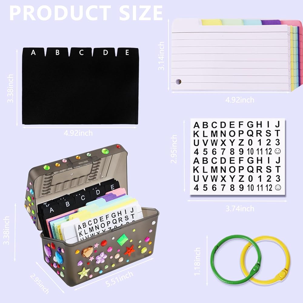 • 💼مجموعة صندوق حامل بطاقات INDEX - تتضمن 30 فواصل لبطاقات الفهرسة الأبجدية، و150 بطاقة فهرسة ملونة (6 ألوان)، وملصقين سهلي القراءة، و6 ملصقات للصناديق، و3 حلقات، و5 ملاحظات لاصقة على شكل أسهم، و4 ملصقات جوهرة (قلب أحمر، خمسة- نجمة مدببة، نادي، مربع)، ملصقات منتفخة ثلاثية الأبعاد (كعك، فواكه، زهور) × 3، جميعها منظمة بأناقة في صندوق تخزين أسود مقاس 3x5 بوصة.