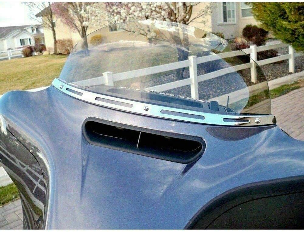 🔻 This highly polished stainless steel windshield trim is accented by four slots that allow the color of the outer fairing to show through.