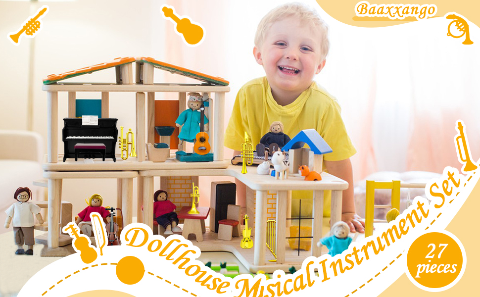 27 قطعة من الآلات الموسيقية لبيت الدمى، نموذج آلة موسيقية صغيرة لبيت الدمى بما في ذلك البيانو والجيتار والكمان والطبول والساكسفون وما إلى ذلك. نموذج ملحق لغرفة الموسيقى الصغيرة لبيت الدمى