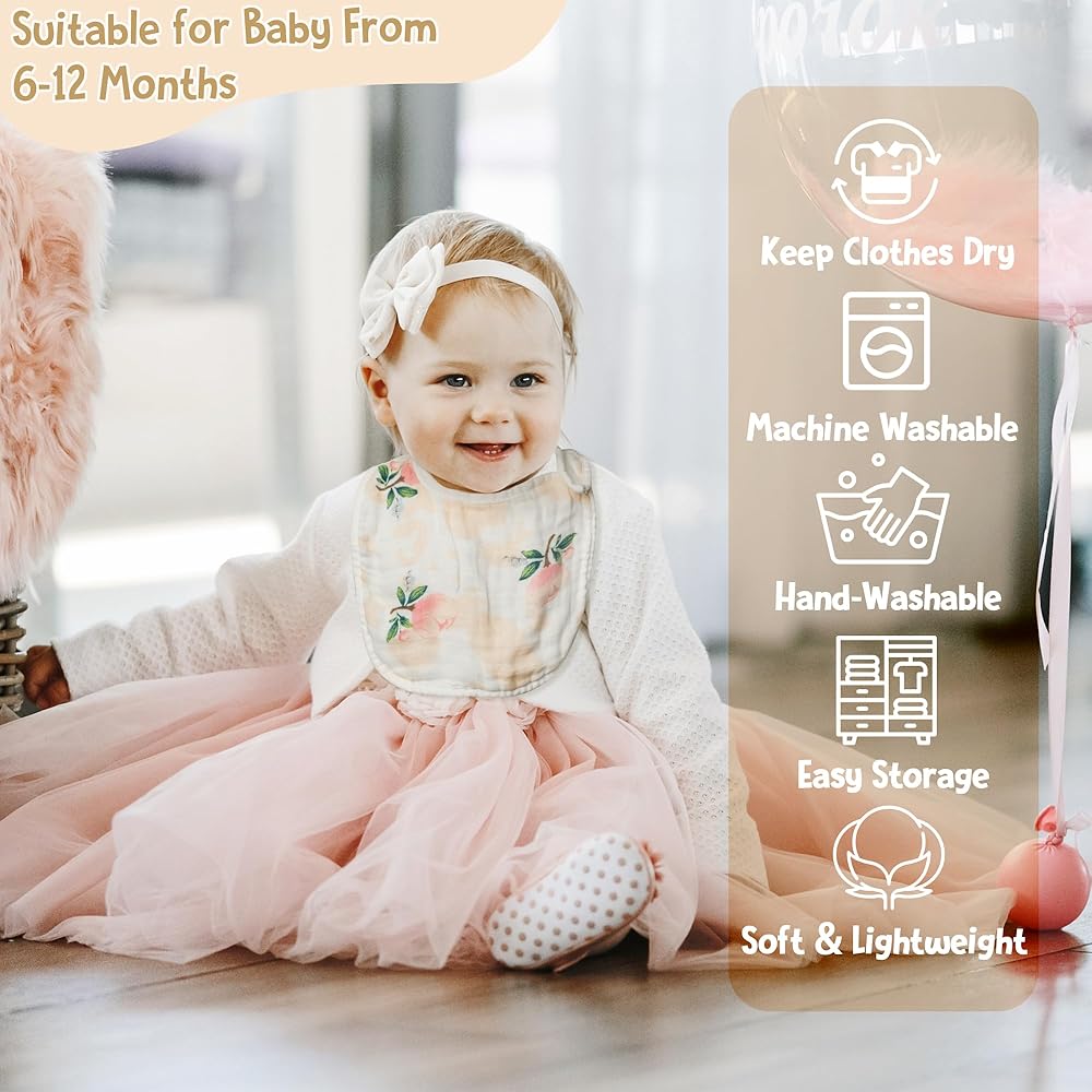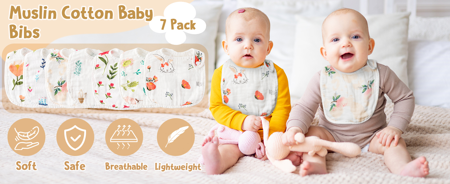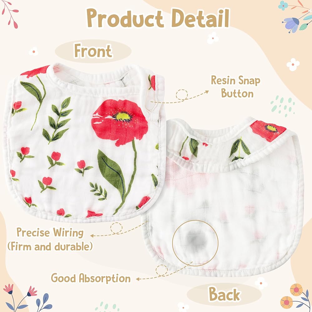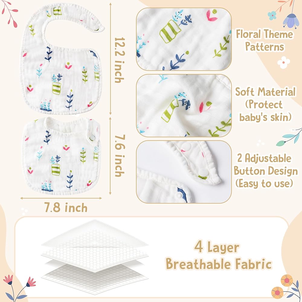 المادة: صدريات الأطفال الزهرية الخاصة بنا مصنوعة من 4 طبقات من نسيج قطن الموسلين، وهو عالي الامتصاص ويمتص بسرعة لعاب الطفل أو الصلصات والحساء التي تسقط أثناء تناول الطعام، مما يحافظ على جفاف الطفل في جميع الأوقات. بالإضافة إلى ذلك، فإن تصميم الموسلين للمرايل أكثر نعومة وتهوية أكثر، مما يوفر تجربة ارتداء مريحة لطفلك.