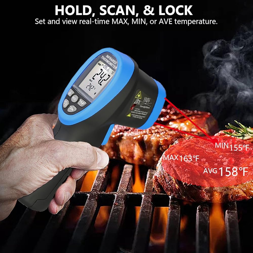 • ☀ مقياس حرارة بالأشعة تحت الحمراء متعدد الوظائف - يقيس بأوضاع MIN/MAX/AVG/DIF، يسمح لك بإعداد منبه درجة الحرارة العالية/المنخفضة/الاختلافية، وينبهك إذا كانت درجة الحرارة أعلى أو أقل من درجة الحرارة المحددة. تساعدك الشاشة الكبيرة ذات الإضاءة الخلفية + المصباح اليدوي على إنجاز المهام في الظلام.