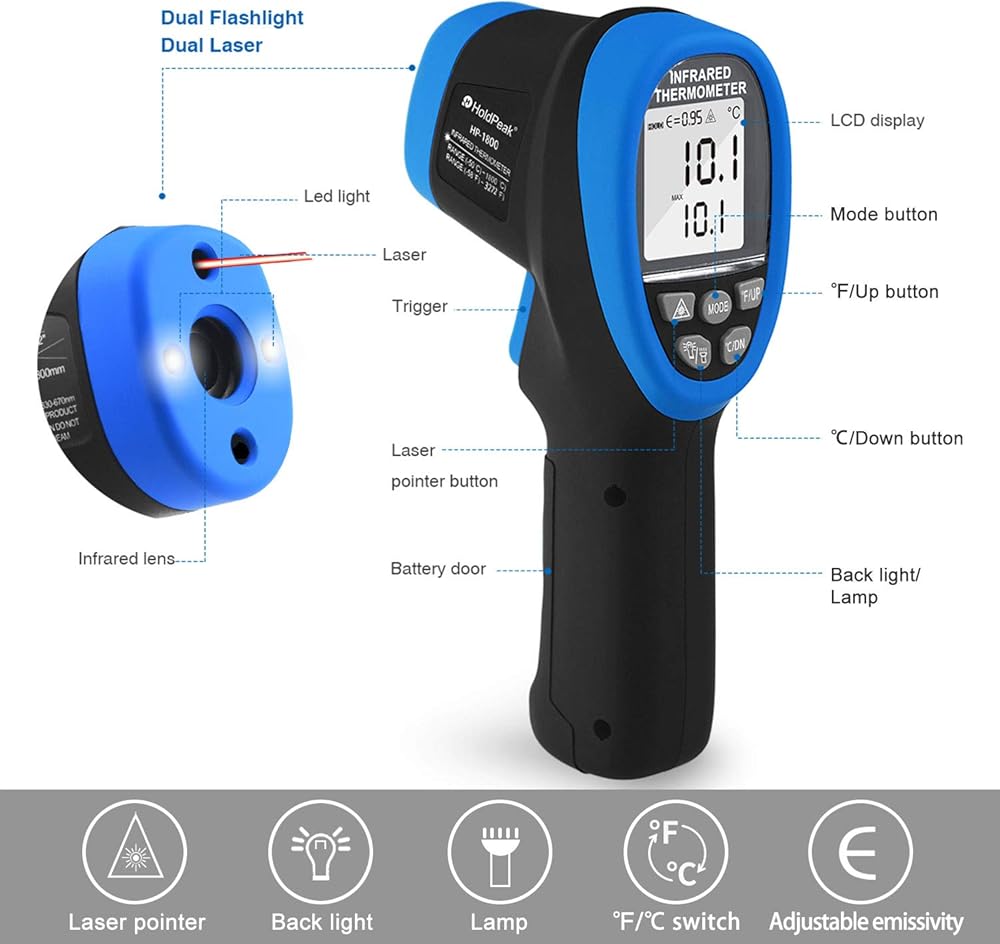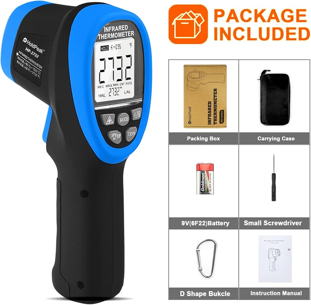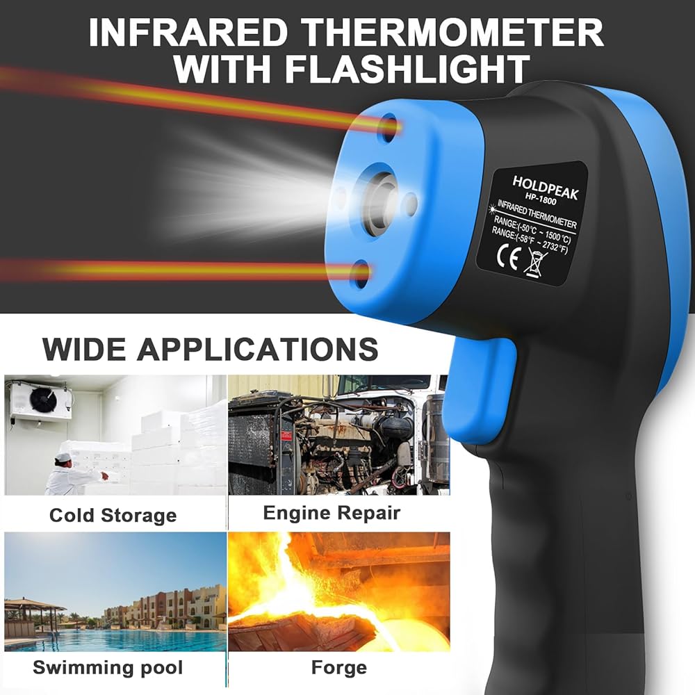 HOLDPEAK بيرومتر D:S=50:1، ميزان حرارة عالي الحرارة بالأشعة تحت الحمراء -58 درجة فهرنهايت ~ 3272 درجة فهرنهايت (-50 درجة مئوية ~ 1800 درجة مئوية)، مسدس ميزان حرارة ليزر صناعي غير ملامس مع مصباح يدوي، مقياس درجة حرارة الأشعة تحت الحمراء الرقمي HP-1800 (ليس