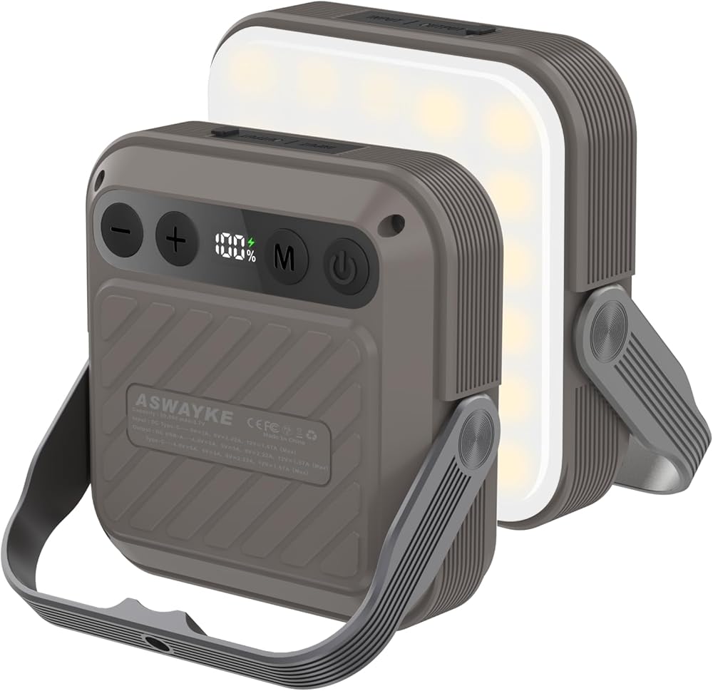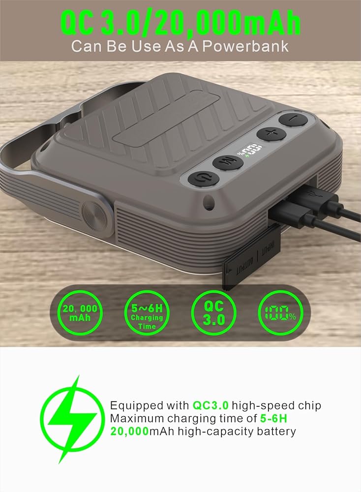 【20000 مللي أمبير/3.7 فولت و QC3. 0/22.5 وات: هذا مصباح تخييم LED خارجي قابل لإعادة الشحن عبر USB ومجهز بشريحة ذكية QC3.0. يمكن استخدامه كبنك طاقة لشحن iPhone بسرعة في المواقف الخارجية أو حالات الطوارئ. وقت الشحن الكامل حوالي 5-6 ساعات، وطاقة إخراج USB-A وUSB-C هي 22.5 وات (كحد أقصى).