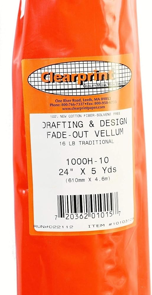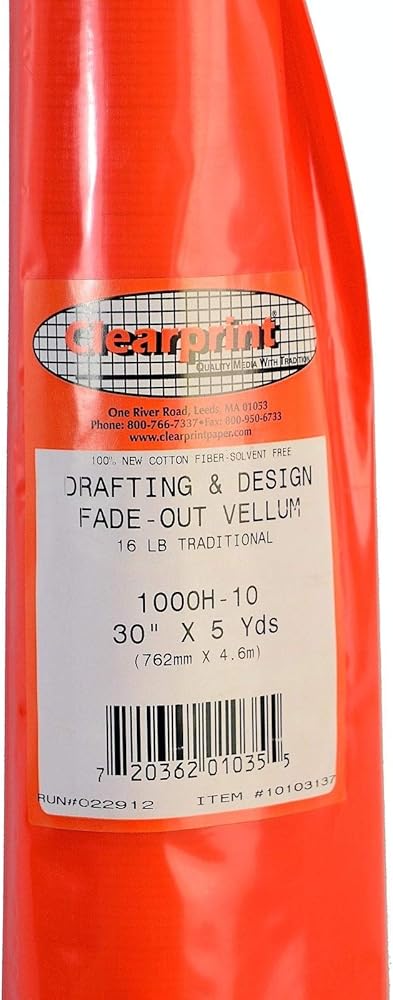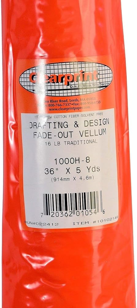 Clearprint 1000H Design Vellum Roll with Printed Fade-Out 8x8 Grid, 16 lb., 100% Cotton, 36" W x 20 Yards Long, is perfect for designing murals, signage and other large designs. Produce professional drawings, tracings and artwork with translucent paper. 8x8 per inch faint blue grid is non-reproducible when scanned or photocopied. Use with pencil, ink, fine art materials and traditional drafting products. Legendary Clearprint 1000H paper boasts a permanent transparent drawing surface with acid-free archival quality, strength, erasability without ghosting and redraw characteristics. Made of 100% new cotton fiber in the USA.