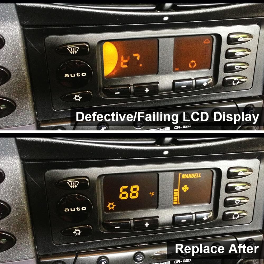 Display Replacement for Porsche 911 (996), Boxster 986 and Ruf Climate Control Unit Compatible with Porsche 911 (996) (1997-2006); Boxster 986/996 (1996-2004) Compatible with RUF 3400 S (1999-2002); 3600 S 2002; RGT (2000-2004); R Turbo (2001-2005) It consists of 1PCS BRAND NEW LCD (not reworked) and 2PCS Elastomeric Zebra Connector Rubber Strips to replace scratched, faded or cracked LCD Display found in the 911 (996), Boxster 986 and Ruf Climate Control Unit. Please verify model and years when purchasing. Reference OEM Numbers: 99665310103, 99665310100, 99665310101, 99665310110FFA, 99665310109FFA, 5HB007691-01, 5HB007691-00, 5HB007691-00, 5HB008247-02, 5HB008247-01 Screen Size: 99.5*35.5 mm Package Included: 1PCS LCD Screen with 2PCS Elastomeric Zebra Connector Rubber Strips We selling LCD display only, the climate control unit in picture as an application scenario instruction, not included for sale.