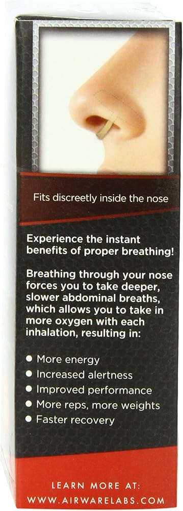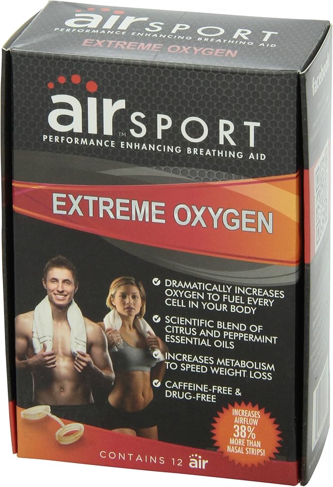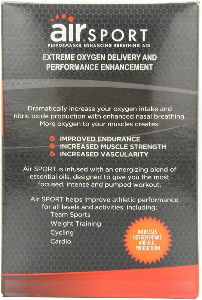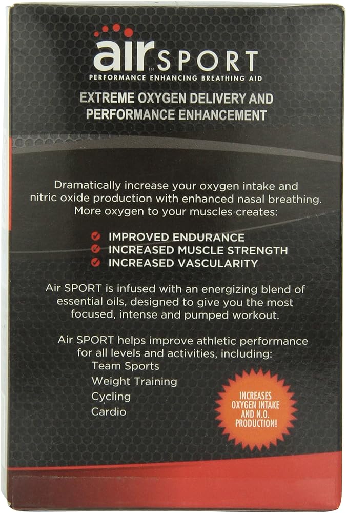 Air sport is a performance enhancing breathing aid that dramatically increases oxygen to fuel every cell in your body. Air sport fits discreetly in the nose to gently open nasal passages and increase airflow 38% more than nasal strips. When breathing though your nose, you take deeper, slower breaths, which means you get more oxygen with each inhalation. The result is more energy, increased alertness, improved performance and faster recovery. Air sport is also infused with an energizing blend of premium essential oils to support a focused, intense, pumped up workout. Air sport is soft, comfortable and discreet and a pliable connector makes removing it easy. Includes 12 air sport onetime use.