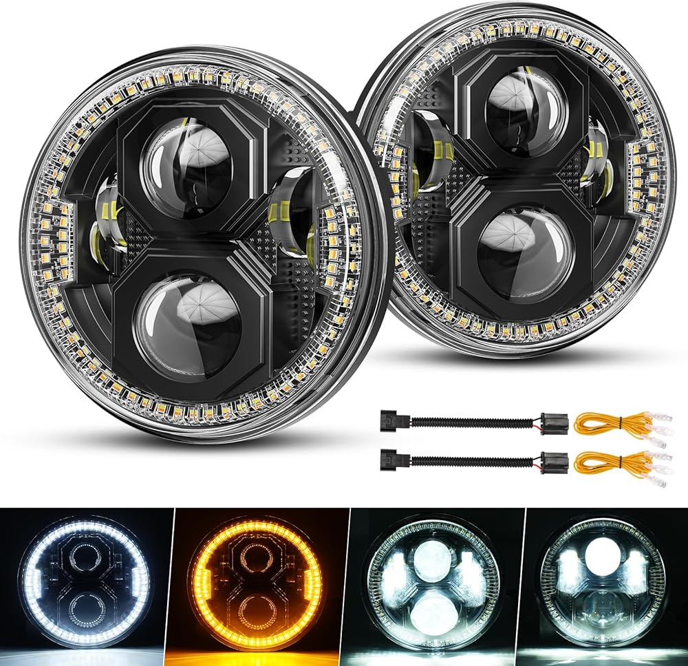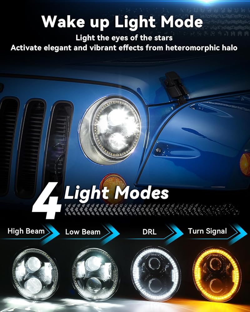 4 أوضاع إضاءة: 4 أوضاع إضاءة للشعاع العالي، والشعاع المنخفض، وأضواء الجري النهارية، وأضواء إشارة الانعطاف مدمجة في مصابيح هالة جيب رانجلر الخاصة بنا. إلى جانب حلقة عين الملاك غير المتجانسة، فهي مضاءة مثل عيون النجوم. أفضل خيار لاستبدال المصابيح الأمامية الهالوجين وHID مباشرة.