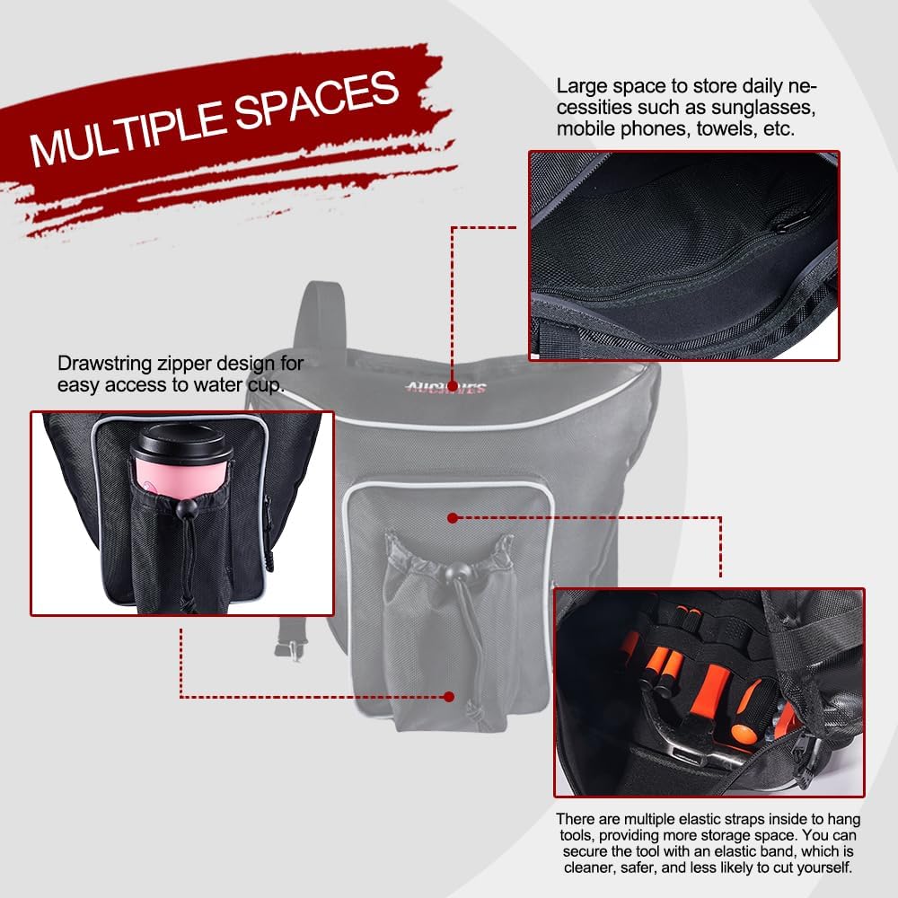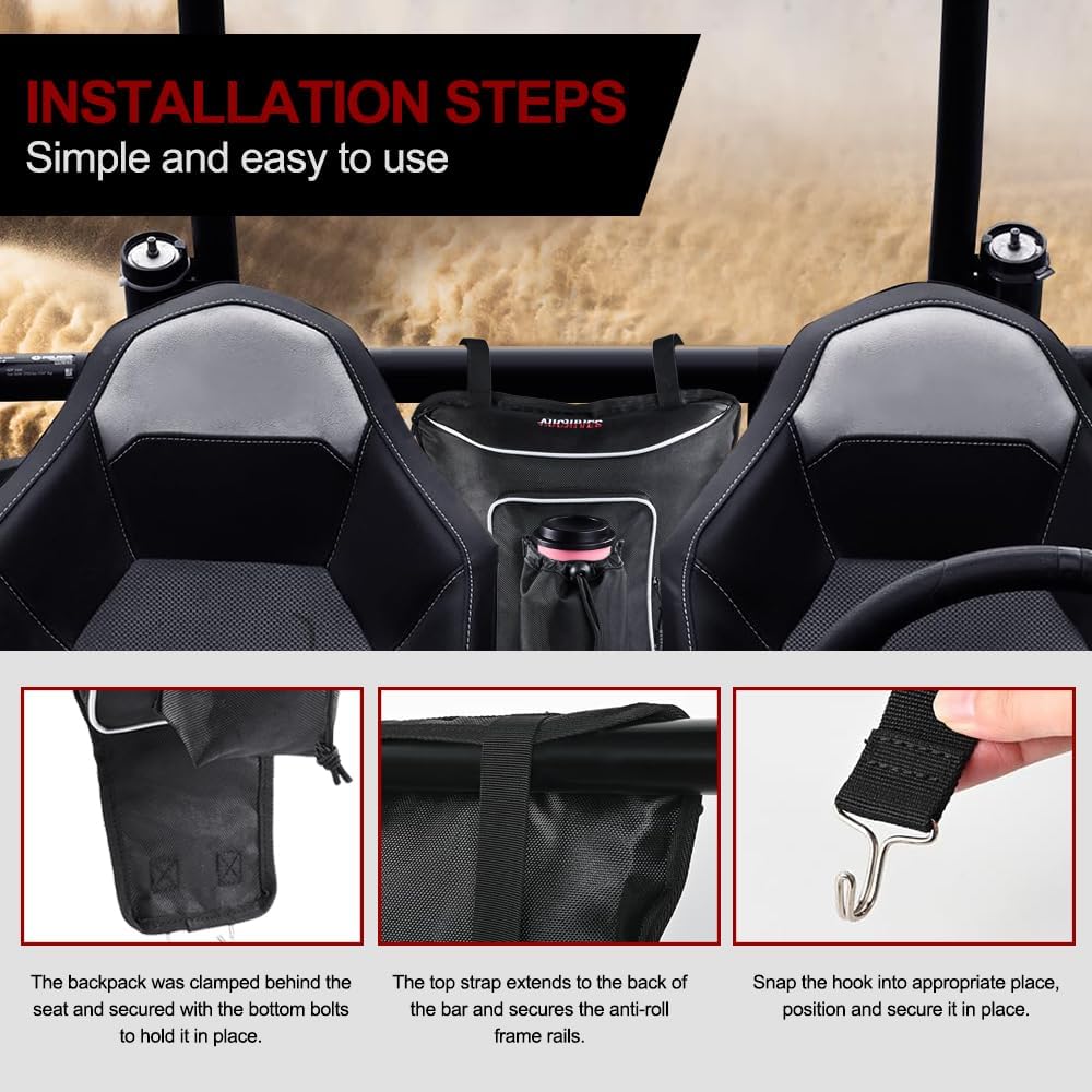 【Extra Storage Space】UTV Center Seat Storage Bag Fits perfectly between the center seats without taking up valuable space.The interior of the bag has a net and elastic straps for multiple hanging tools, providing more storage space.You can keep sunglasses, cell phones, towels, and toolkits within reach for cleaner, safer and less likely to cut yourself.The water cup is more convenient to take, the drawstring zipper is designed to open and close, which can improve the safety of storing items during driving and avoid losing items on the way.