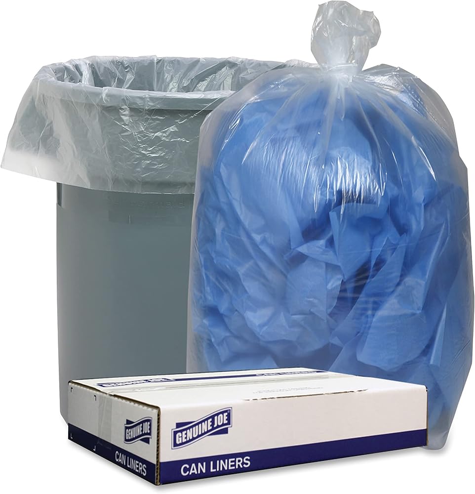 Clear, low-density liners feature a strong, resilient construction that securely holds a full load to easily transport bags to your disposal area. Star-bottom seal distributes the weight of contained items more evenly for dependable performance. Extra-strong design is leak-resistant to virtually eliminate liquids from escaping. Coreless roll is perforated for quick, simple access to liners.