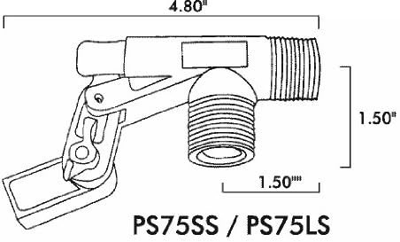 This Kerick PS75LS float valve is a standard-mount style and is made of PVC with 18-8 stainless steel hardware. The valve has a 0.30" orifice and its estimated rate of flow is 13 gallons per minute (gpm) at 30 pounds per square inch (psi) and 16.5 gpm at 60 psi. The valve inlet and outlet have 3/4" NPT male threads for attaching to NPT female fittings. The valve is made of National Sanitation Foundation (NSF) approved PVC (polyvinyl chloride), its replaceable seals are made of TPE (thermoplastic elastomer) for durability and chemical resistance, and its hardware is made of 18-8 stainless steel for corrosion resistance. The valve uses a 12" x 1/4" stainless steel rod and a 4x5" float ball (sold separately). This float valve is suitable for use in a variety of applications, such as fountains, livestock water tanks, and chemical manufacturing plants.