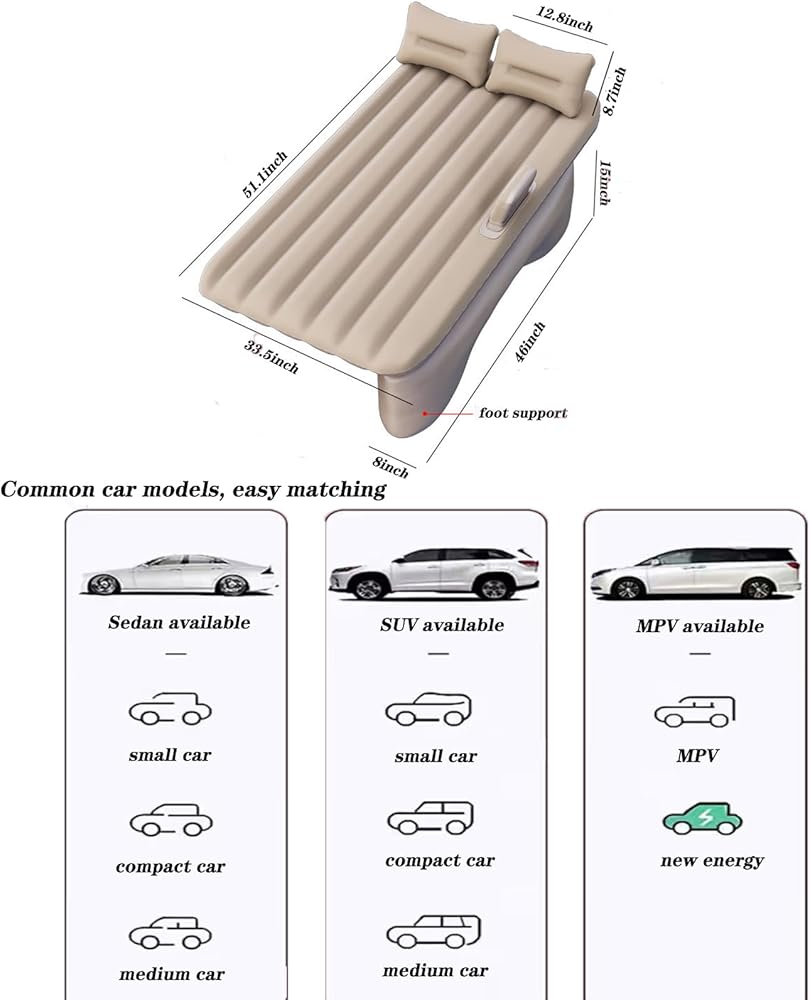 【Size】car bed 51.1x33.5x15in,with Inflator for air mattress,universal for all models