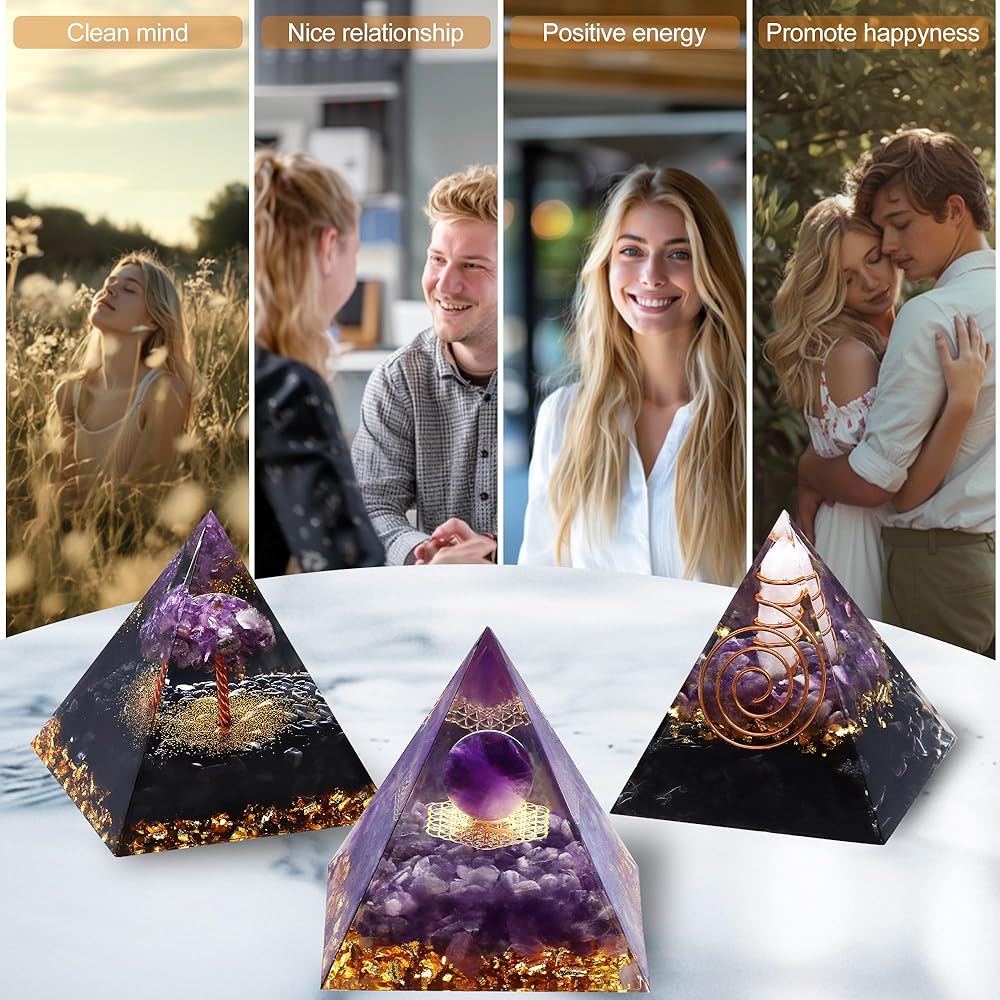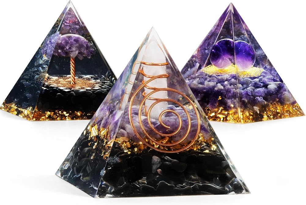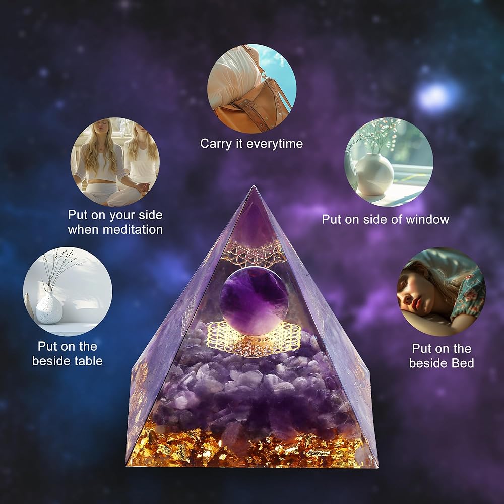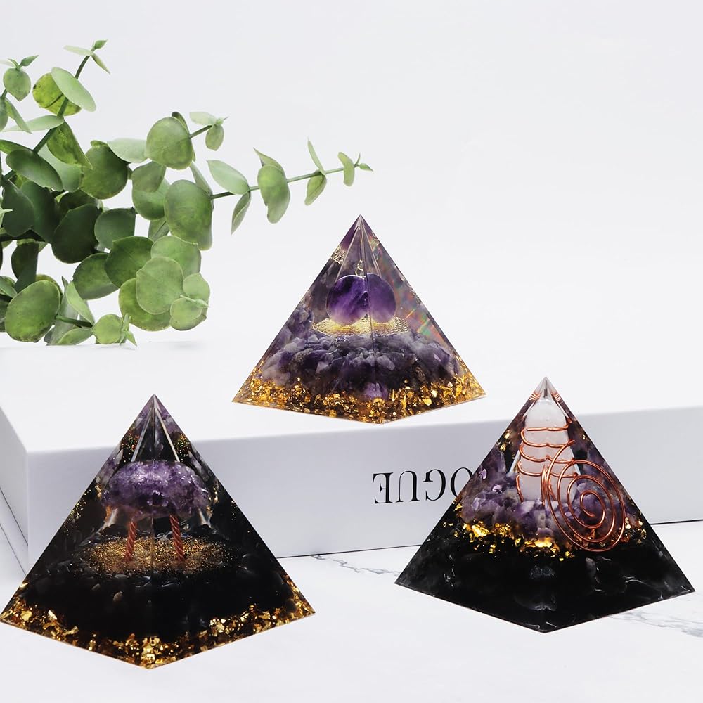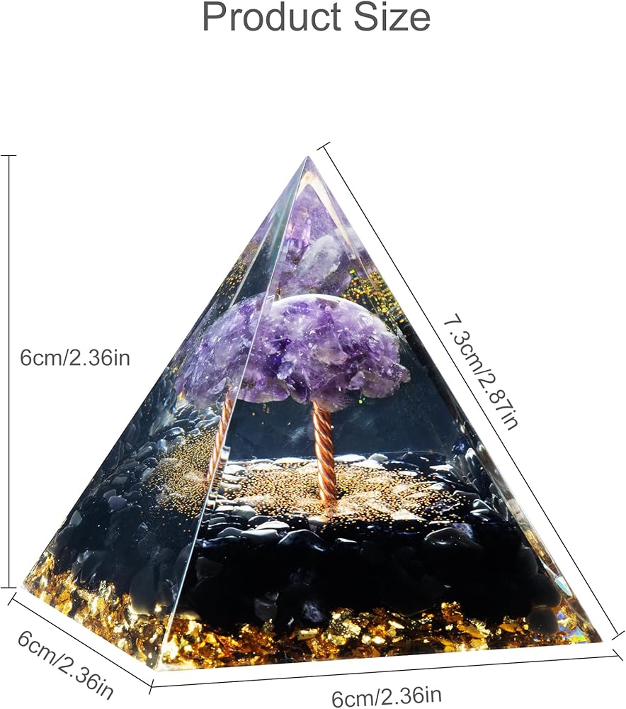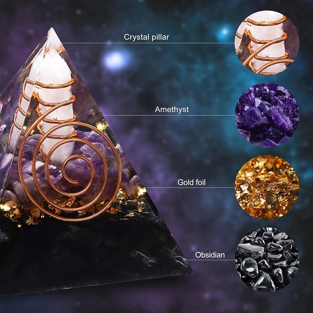 Handmade Crystal Pyramid : Our orgone crystal pyramid is an exquisite handmade piece made of copper coils, amethyst, white crystal column, gold leaf and resin. In terms of quality, we have strengthened the characteristics of natural resin to make the entire orgonite crystal pyramid more clear.