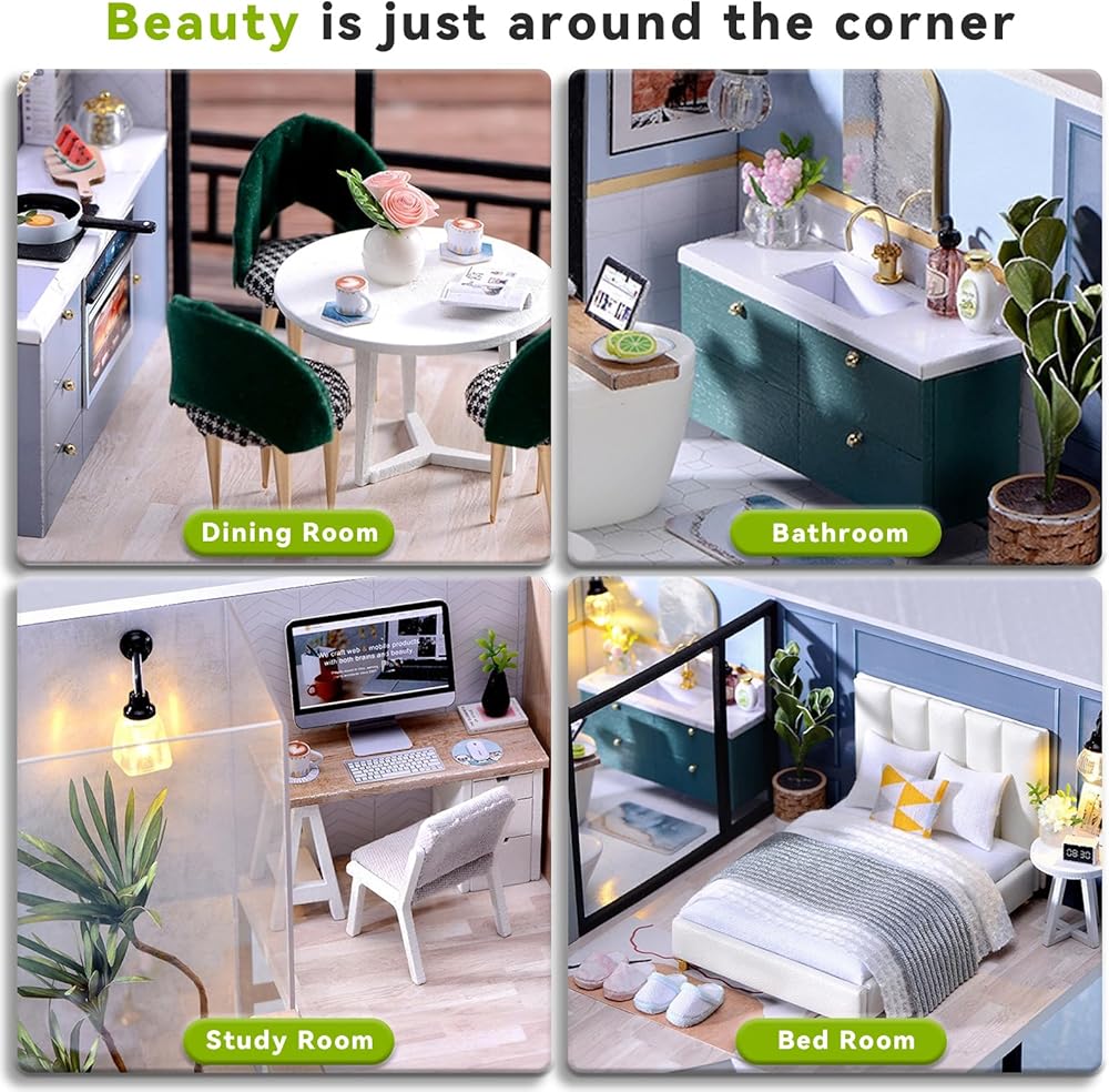 سلامة المواد وعدم التلوث: تستخدم مجموعة المنزل المصغرة مواد آمنة بما في ذلك الخشب والورق والبلاستيك والنسيج، وغطاء غبار مجاني. الحجم النهائي: 9.25 (طول) "*7.48 (عرض)" *5.9 (ارتفاع)". يأتي مع تعليمات مفصلة باللغة الإنجليزية ملونة، باستخدام صور تجميع المنتج الحقيقية، واضحة وسهلة الفهم.