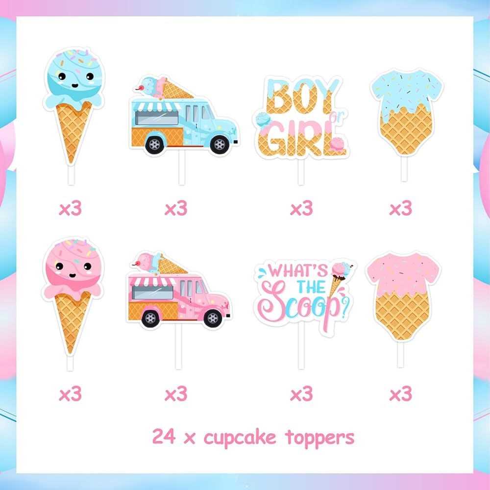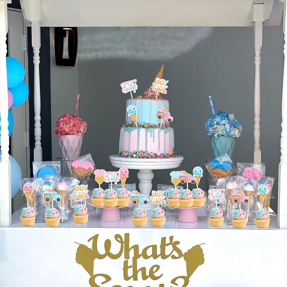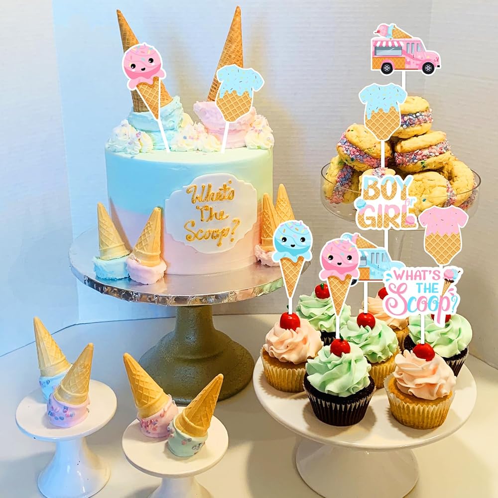 What's The Scoop Gender Reveal Cake Decorations: You will receive 24 pieces ice cream theme cupcake toppers in total, including 8 different kinds of cupcake toppers, the sufficient quantities and different styles to meet your decoration needs, make your party more eye-catching and wonderful!
