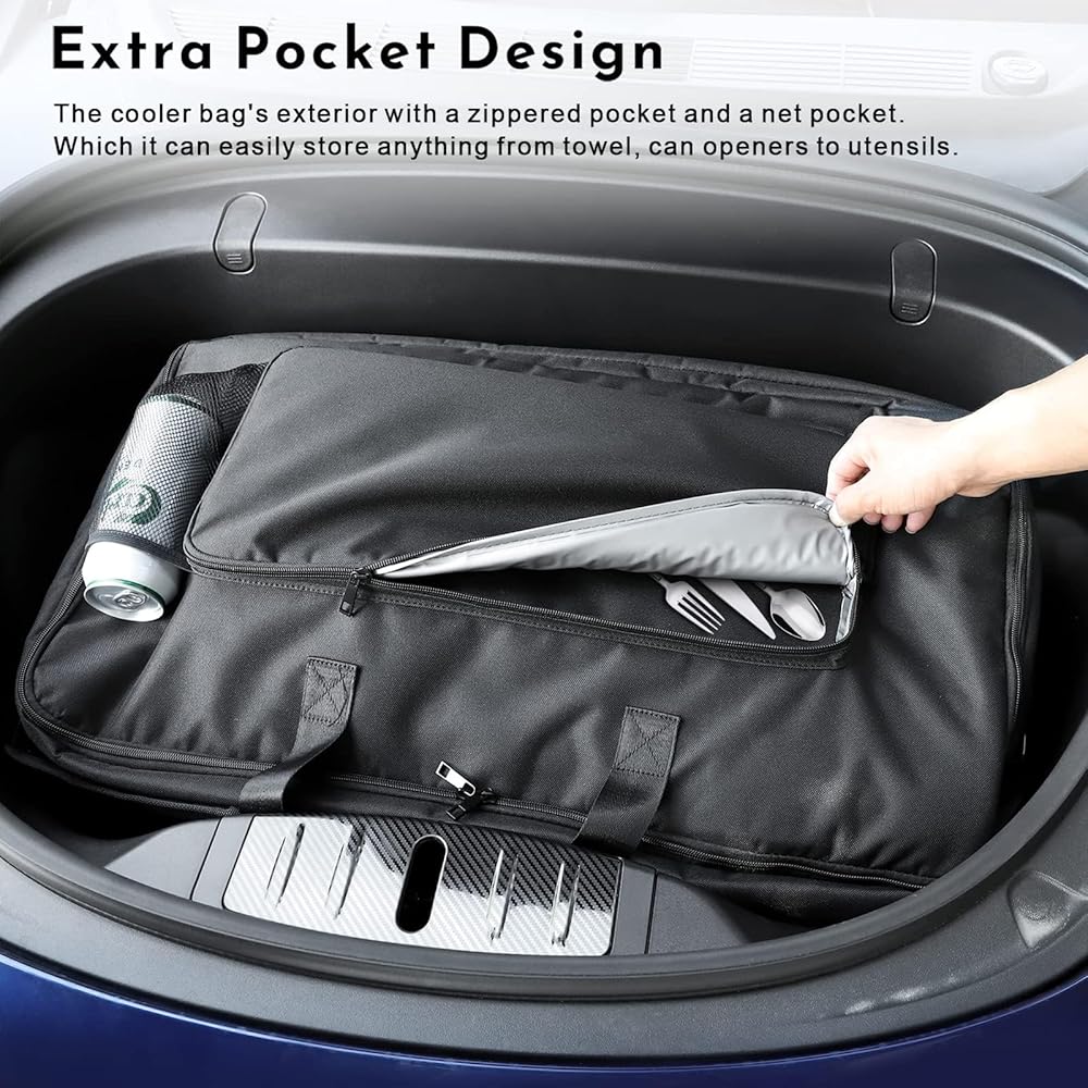 • مساحة تخزين إضافية: يتميز الجزء الخارجي لحقيبة التبريد frunk بجيب بسحاب وجيب شبكي، مما يوفر مساحة تخزين إضافية للأشياء مثل المناشف وفتاحات العلب والأواني، مما يجعلها ملحقًا عمليًا ومتعدد الاستخدامات لسيارة Tesla الخاصة بك.