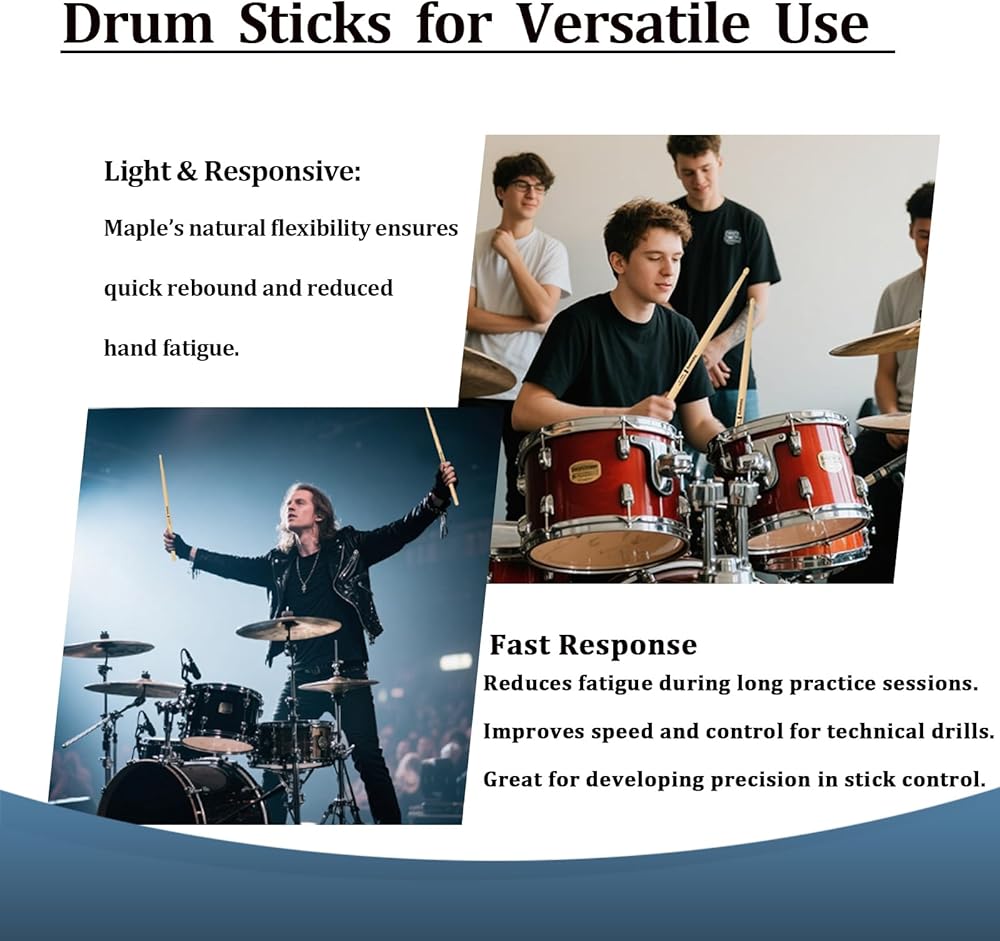 أعواد الطبل 7A: أعواد الطبل 7A هي واحدة من أعواد الطبل الأكثر كلاسيكية والأكثر استخدامًا. مناسبة لتشغيل الموسيقى الخفيفة، ومناسبة لموسيقى الجاز والبوب والروك الخفيفة وأنواع الموسيقى الأخرى.