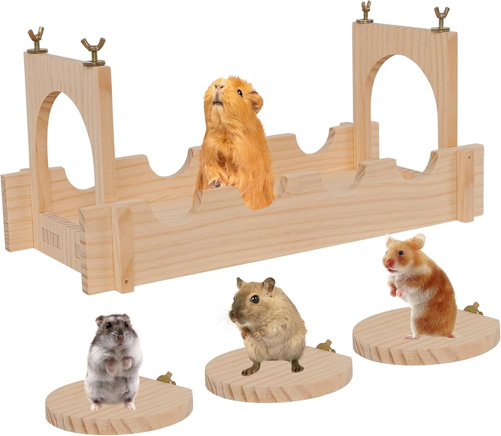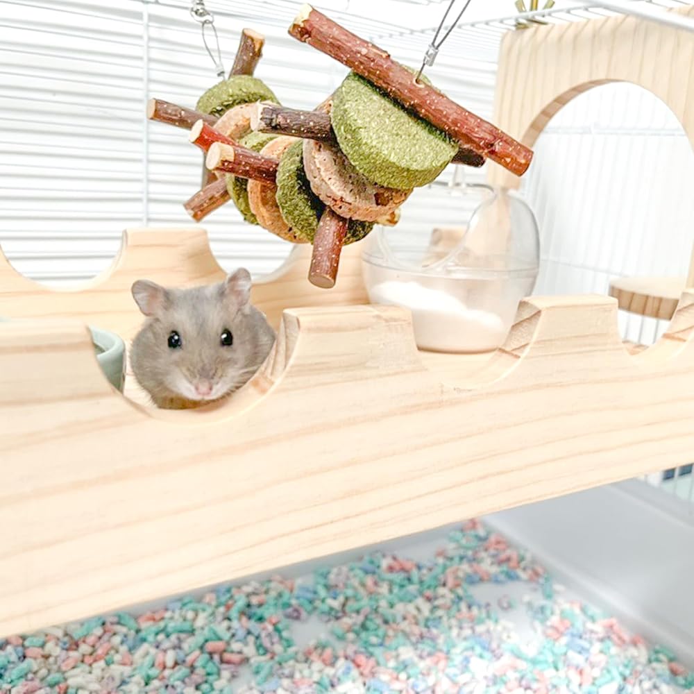CAWUWE Chinchilla Cage Accessories Wooden Suspension Bridge for Small Animals with 3 Hanging Climb Platform Large Hamster Toy for Cages