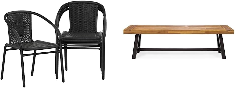 Flash Furniture Lila 4 Pack Black Rattan Indoor-Outdoor Restaurant Stack Chair & Christopher Knight Home Carlisle Outdoor Acacia Wood and Rustic Metal Bench, 14. 75 x 63 x 17. 50 inches