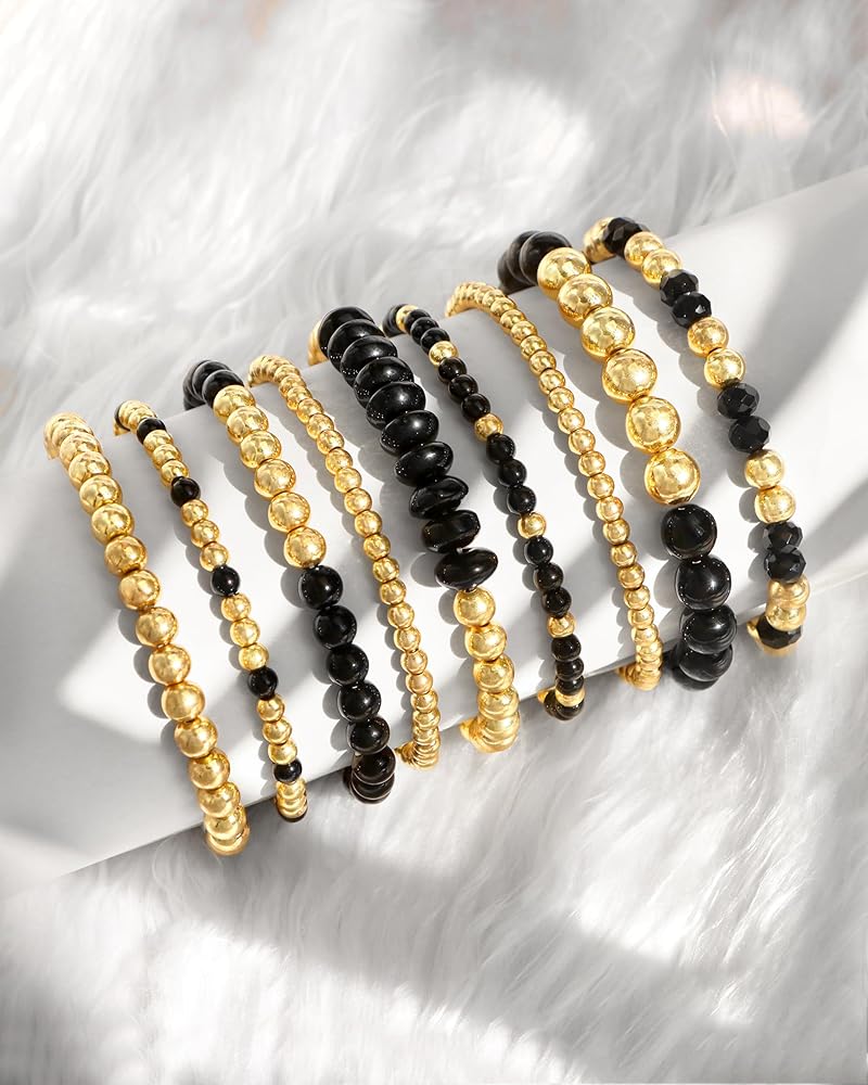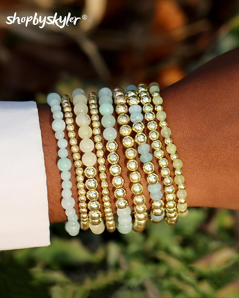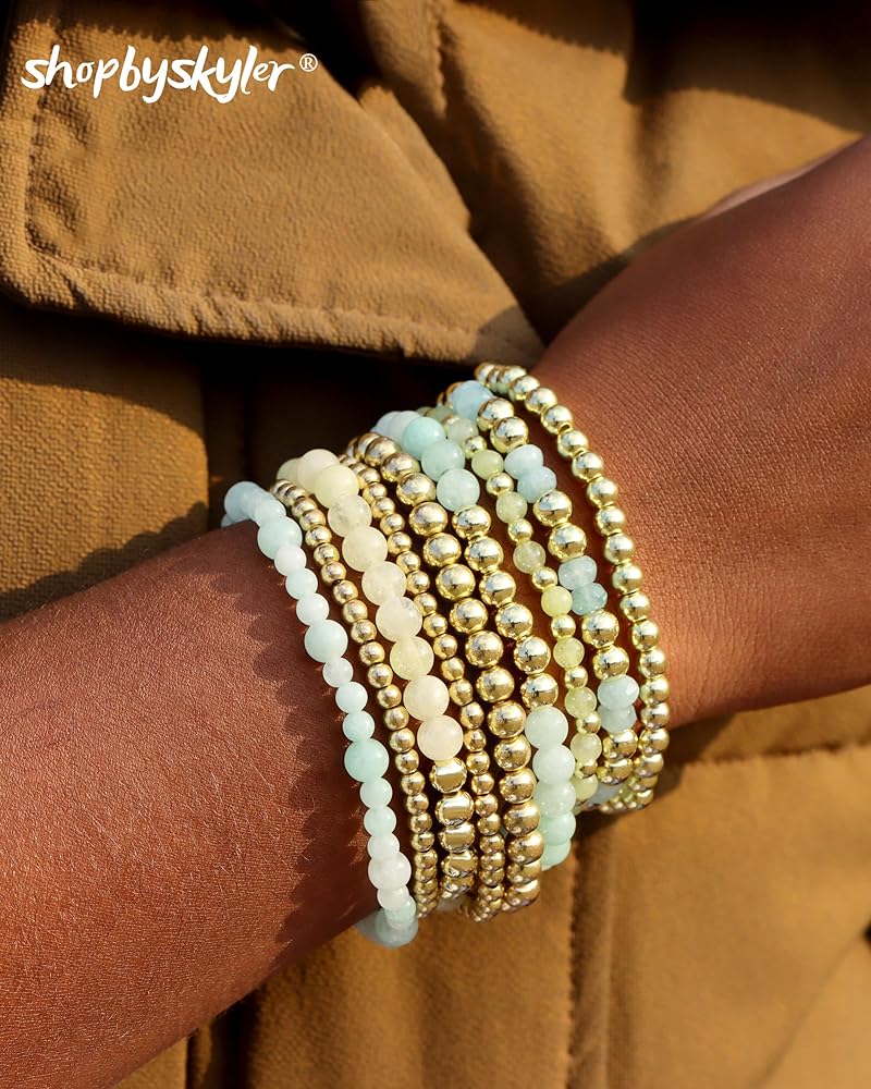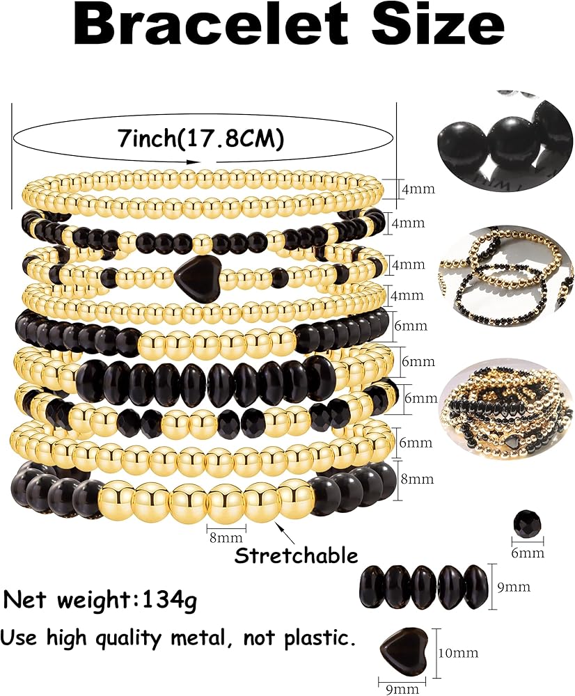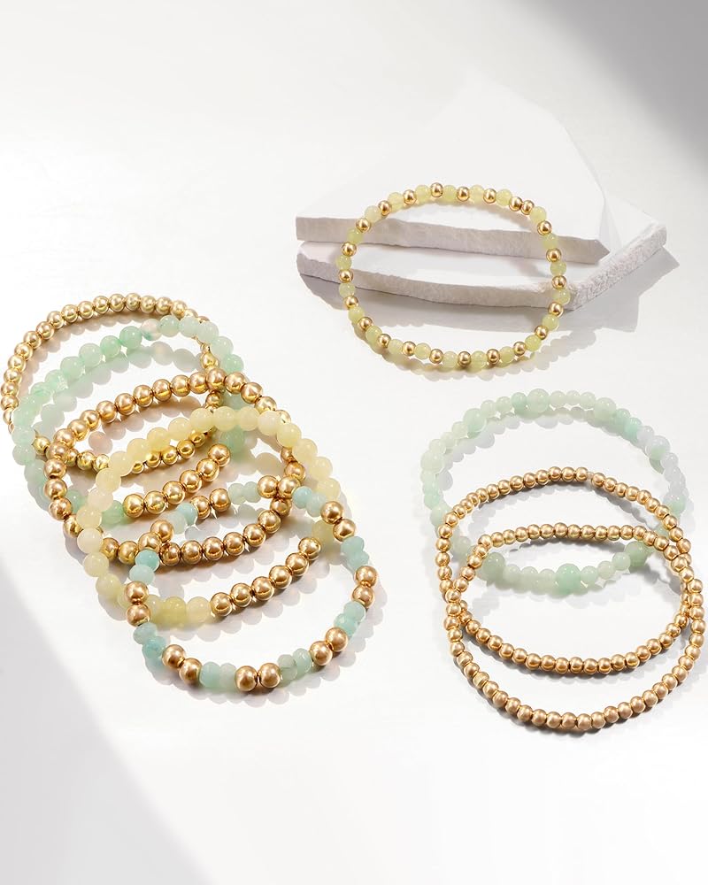 Gold Bracelet Set: 9 PIECE Stackable gold bracelet set with black, blue, pink, cyan-blue options.The green color have 8pcs stackabe bracelet,The stone beads bracelet is 7 inches in length, and the elastic bead bracelet fits most wrist circumferences.