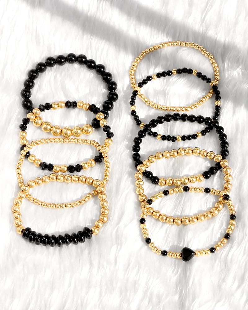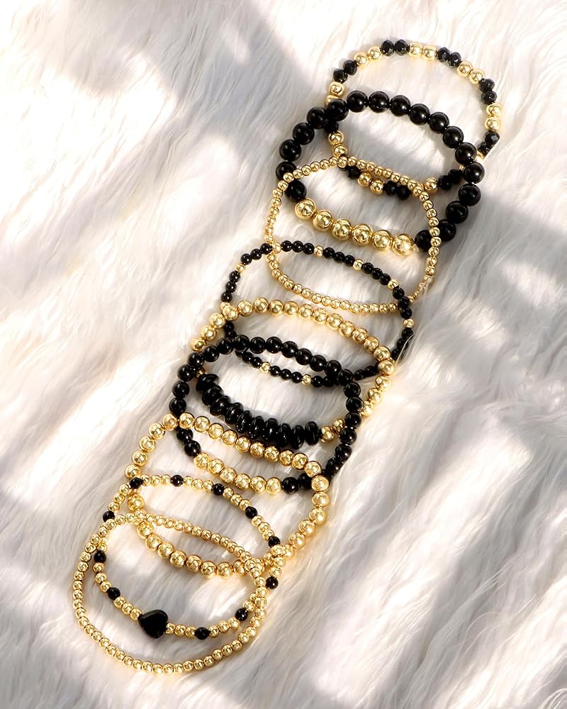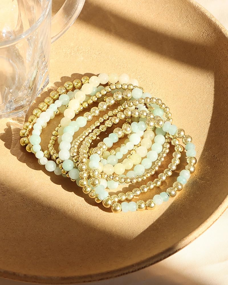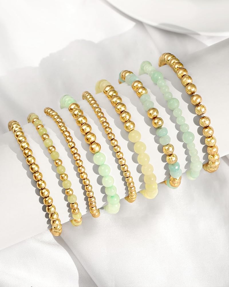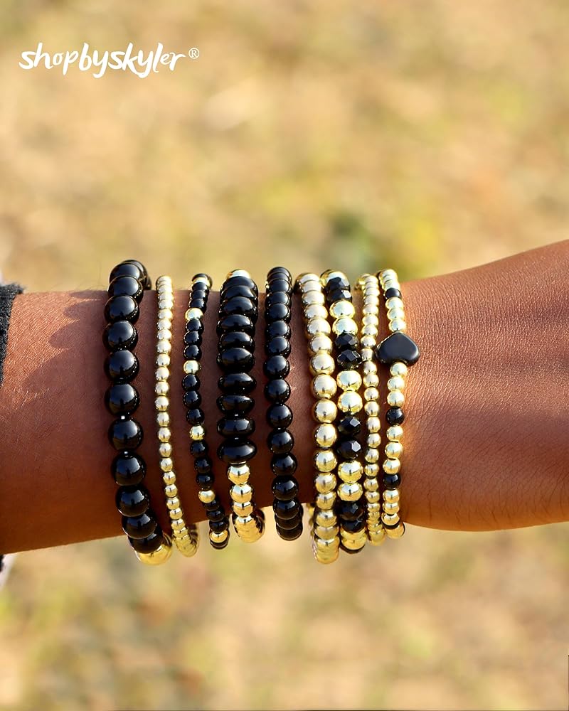 Gold Bracelet Set: 9 PIECE Stackable gold bracelet set with black, blue, pink, cyan-blue options.The green color have 8pcs stackabe bracelet,The stone beads bracelet is 7 inches in length, and the elastic bead bracelet fits most wrist circumferences.